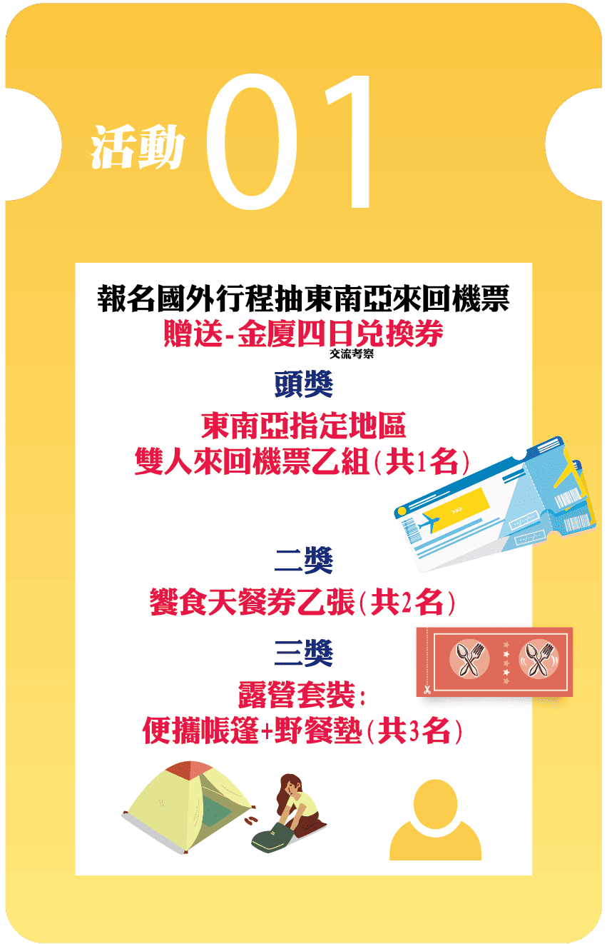 獎項:首獎-東南亞指定地區雙人來回機票乙組(共1名)、二獎-饗食天餐券乙張(共2名)、三獎-露營裝備(共3名)
