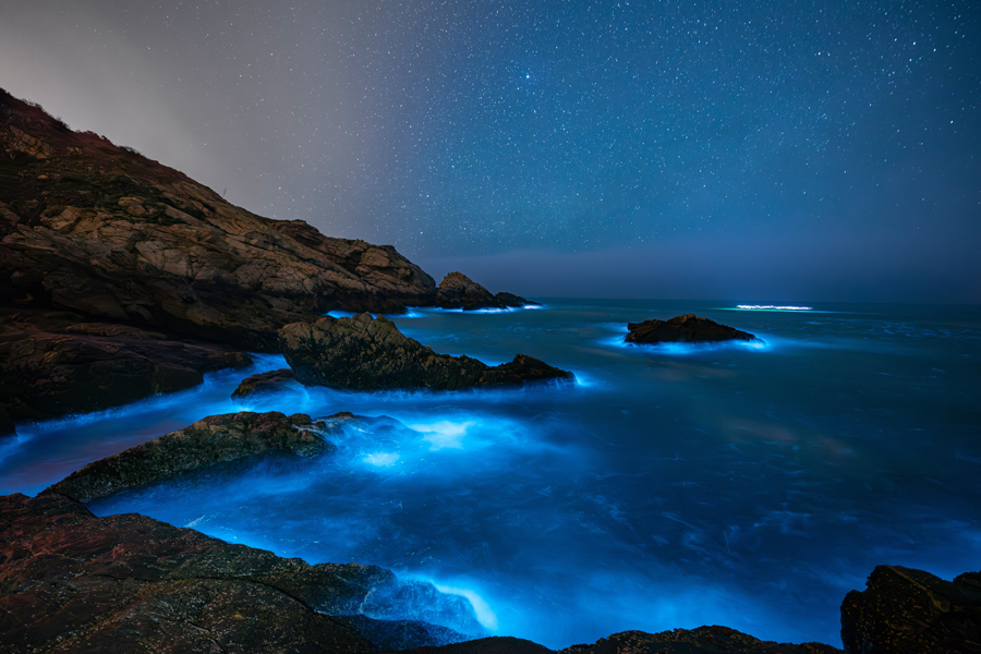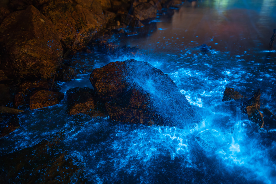 風浪吹撫,或拍打礁岸,而激出的點點藍色螢光,有時候,綻放整片夢幻藍光,有時候,隨著水