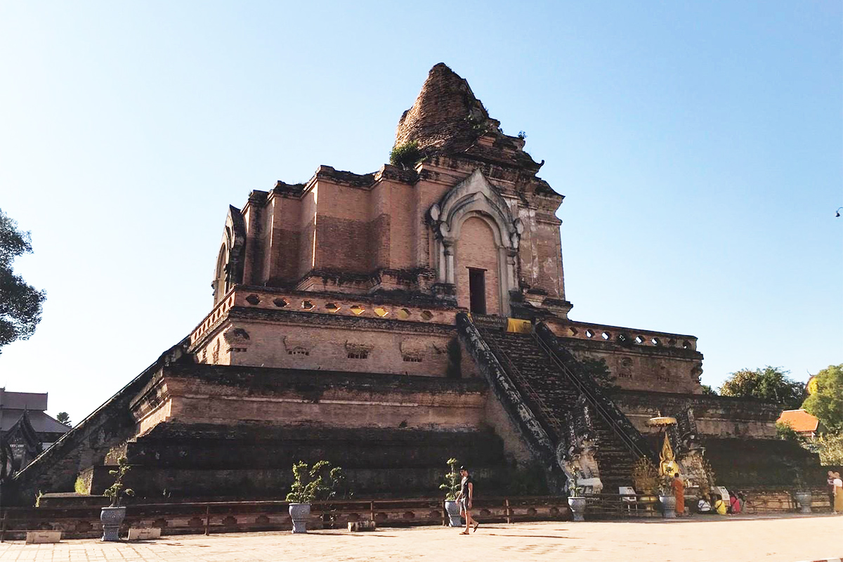 【大塔寺】位於清邁古城的中央,建於14世紀期間,是蘭納王朝時期的大佛塔,曾經是泰北最高的建築,因經歷了大地震、泰緬戰爭砲擊及雷擊後,多少損毀了原蹟,但是頹圮卻莊嚴的建築仍引領許多善男信女前來參拜。塔中原供奉的玉佛已轉送曼谷,現在這有的是當今泰皇出資重建的「玉佛」,寺廟近年由聯合國教科文組織出資修繕,以保存原貌。