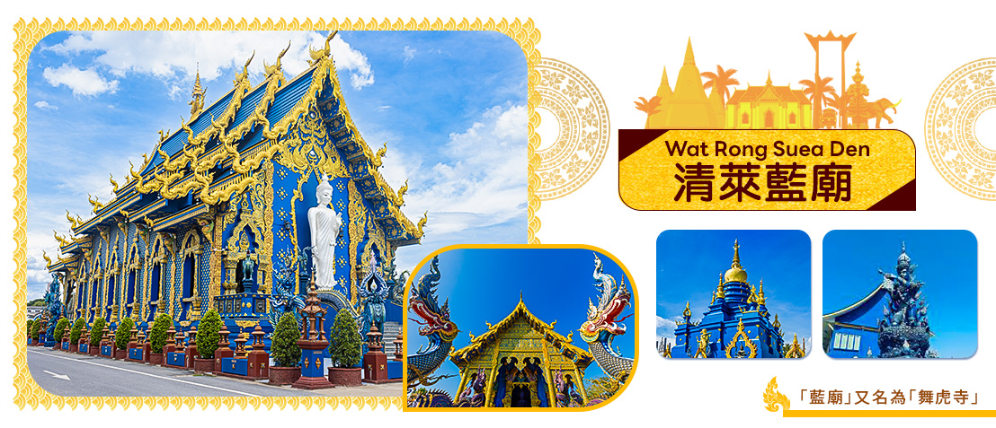 「藍廟」又名舞虎寺(Blue Temple ; Wat Rong Suea Ten ; วัดร่องเสือเต้น),泰文原意為「跳舞的老虎」,始建於1996年。藍廟由清萊白廟設計者的徒弟所設計建造,雖然規模較白廟小,但是整體外觀呈現耀眼宏偉的藍色,內部佛像精緻,是一座傳統與現代藝術完美融合的泰式寺廟。藍廟位於Rimkok區,距離清萊中心10分鐘車程,可免費開放參觀。