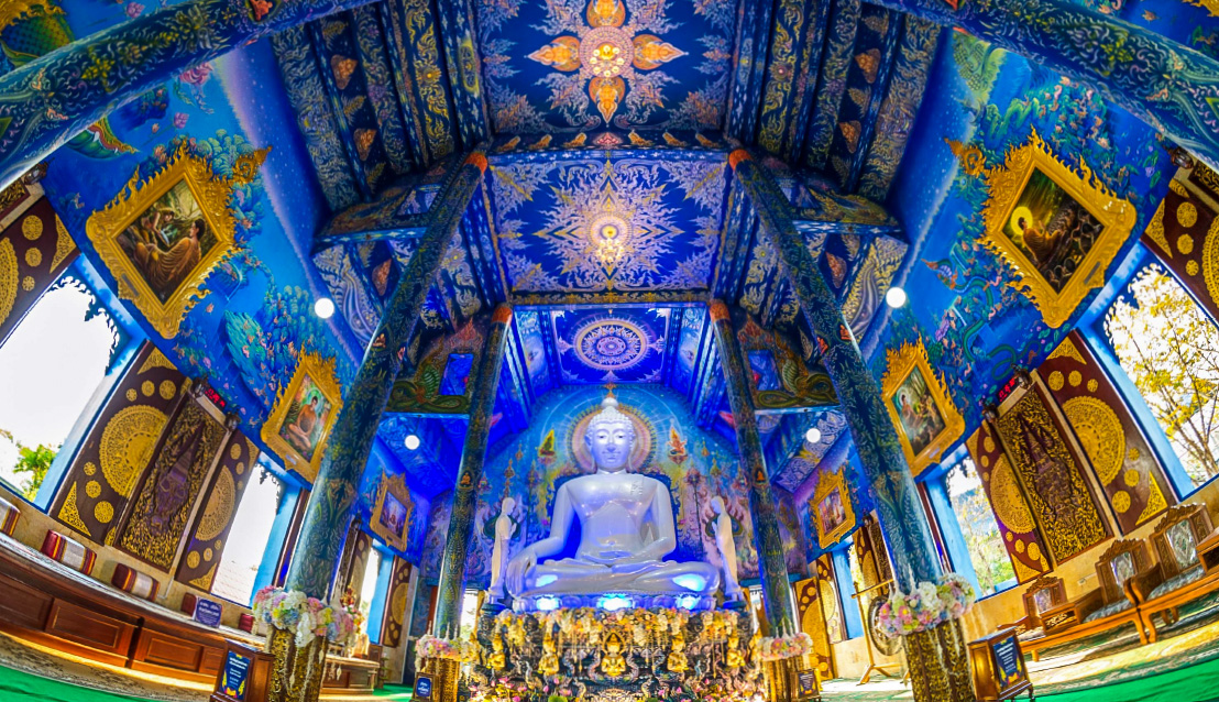 清萊除了白廟還有一座必去的廟宇-藍廟WAT RONG SUEA TEN,這座廟宇是由創造白廟的大師徒弟打造,歷史比泰北著名的黑廟、白廟還要久遠,在殿內四周及天花板都是藍色系的壁畫,建築造型融合蘭納和緬甸風,與白廟有著完全不同的風格。壁畫主要是描述釋迦牟尼佛生平事蹟,畫工精緻、色彩鮮艷,讓人目不睱給。