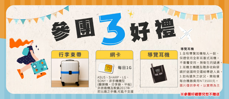 含網卡每人一張、導覽耳機每人一台、行李束帶每人一條。