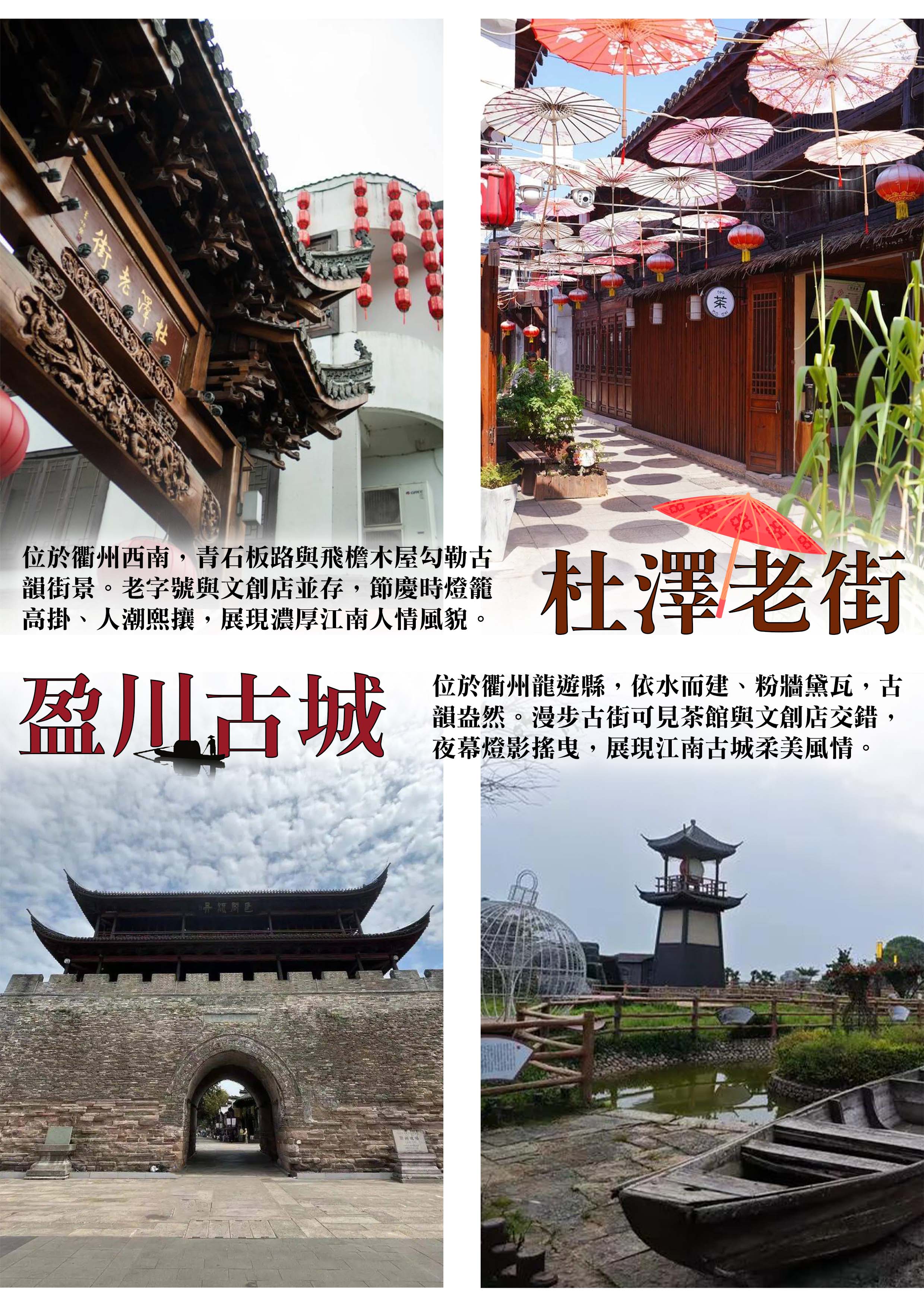 充滿古韻人情的歷史街巷【杜澤老街】杜澤老街位於衢州市區西南方的青石板路、飛檐木屋與高掛紅燈籠,構成濃厚的江南風情。街上保留了多座清末民初建築,穿梭其間可尋見老字號店鋪與文創小店的融合氣息。每逢節慶,燈籠高掛、民俗表演熱鬧登場,讓人感受古街的煙火與活力。這裡不僅是拍照打卡的好去處,更是了解衢州舊時商貿文化與生活風貌的最佳窗口。