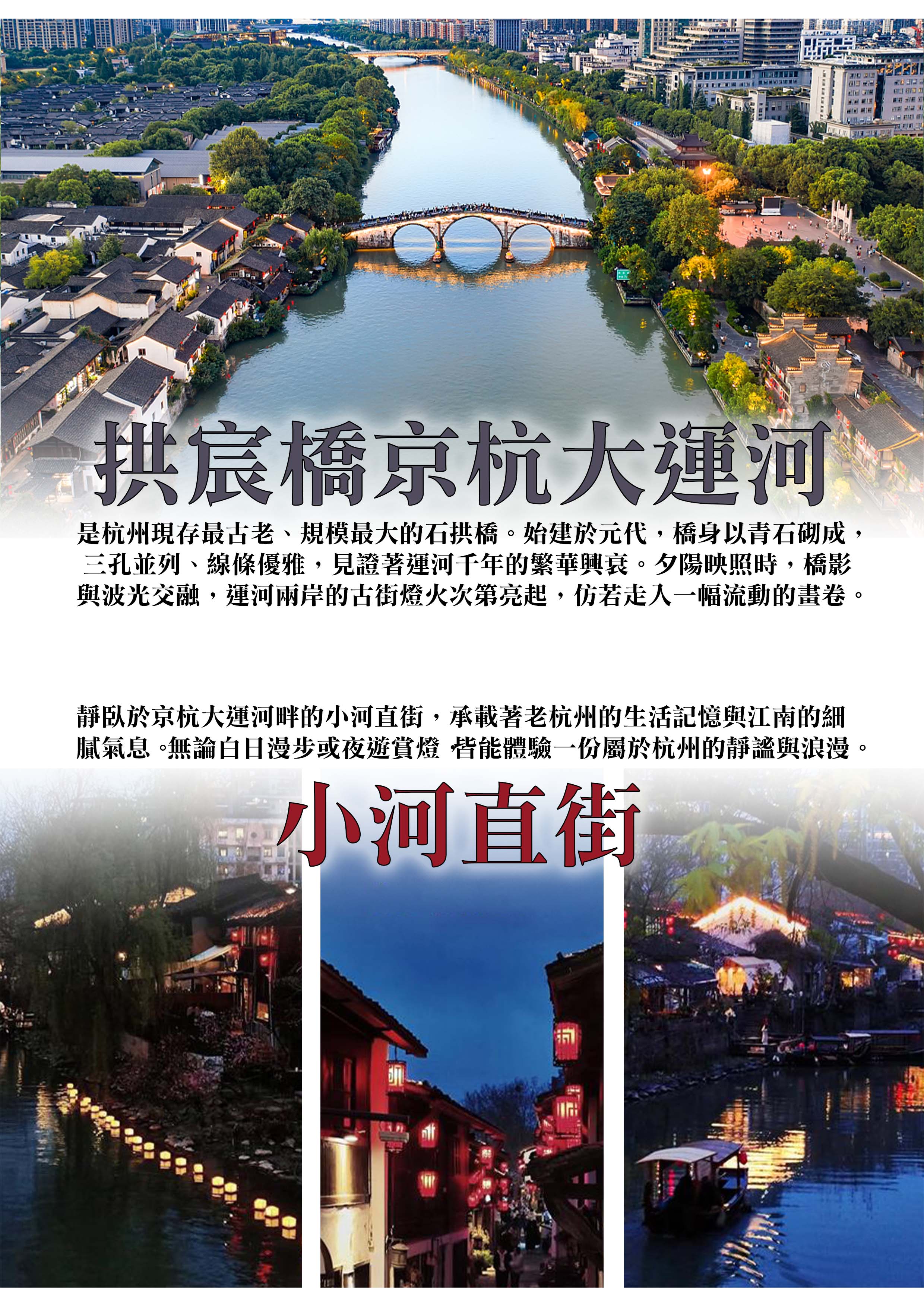 【拱宸橋.京杭大運河】橫跨於京杭大運河之上的拱宸橋,是杭州現存最古老、規模最大的石拱橋。始建於元代,橋身以青石砌成,三孔並列、線條優雅,見證著運河千年的繁華興衰。站在橋上遠望,碧水悠悠、白牆黛瓦錯落於岸邊,江南水鄉的柔情盡收眼底。夕陽映照時,橋影與波光交融,運河兩岸的古街燈火次第亮起,仿若走入一幅流動的畫卷。乘船穿橋而過,更能體會「橋通南北、水連古今」的詩意與韻味,是感受杭州古運河文化與人文風情的絕佳之地。