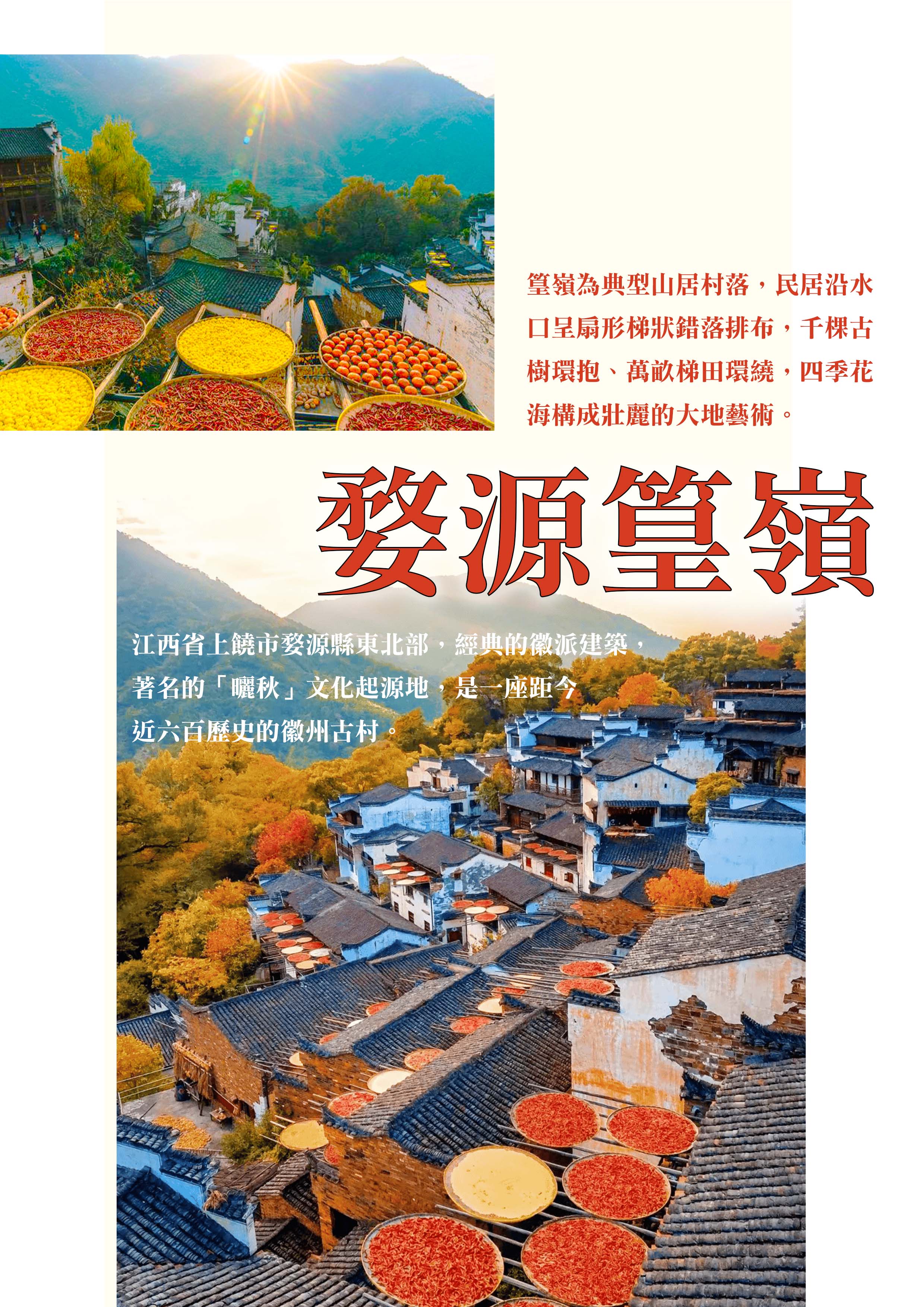 篁嶺位於江西省上饒市婺源縣東北部,是典型山居村落,以懸崖人家、曬秋美景聞名中外。整個村落依山而建,層層屋舍錯落分布,白牆黛瓦在山巒綠意間交織出壯麗畫卷。遊客可搭乘纜車登山俯瞰村景,遠眺雲霧飄渺的梯田與古村全貌;亦可乘電瓶車穿梭於山腳與入口之間,輕鬆體驗徽州山村的靜謐氛圍。每至秋季,家家戶戶屋前屋後曬滿椒紅、菊黃、柿橙等農作,繪出婺源最經典的「曬秋圖景」。這裡不僅是攝影愛好者的天堂,更是感受人文、自然與生活共融的世外桃源。