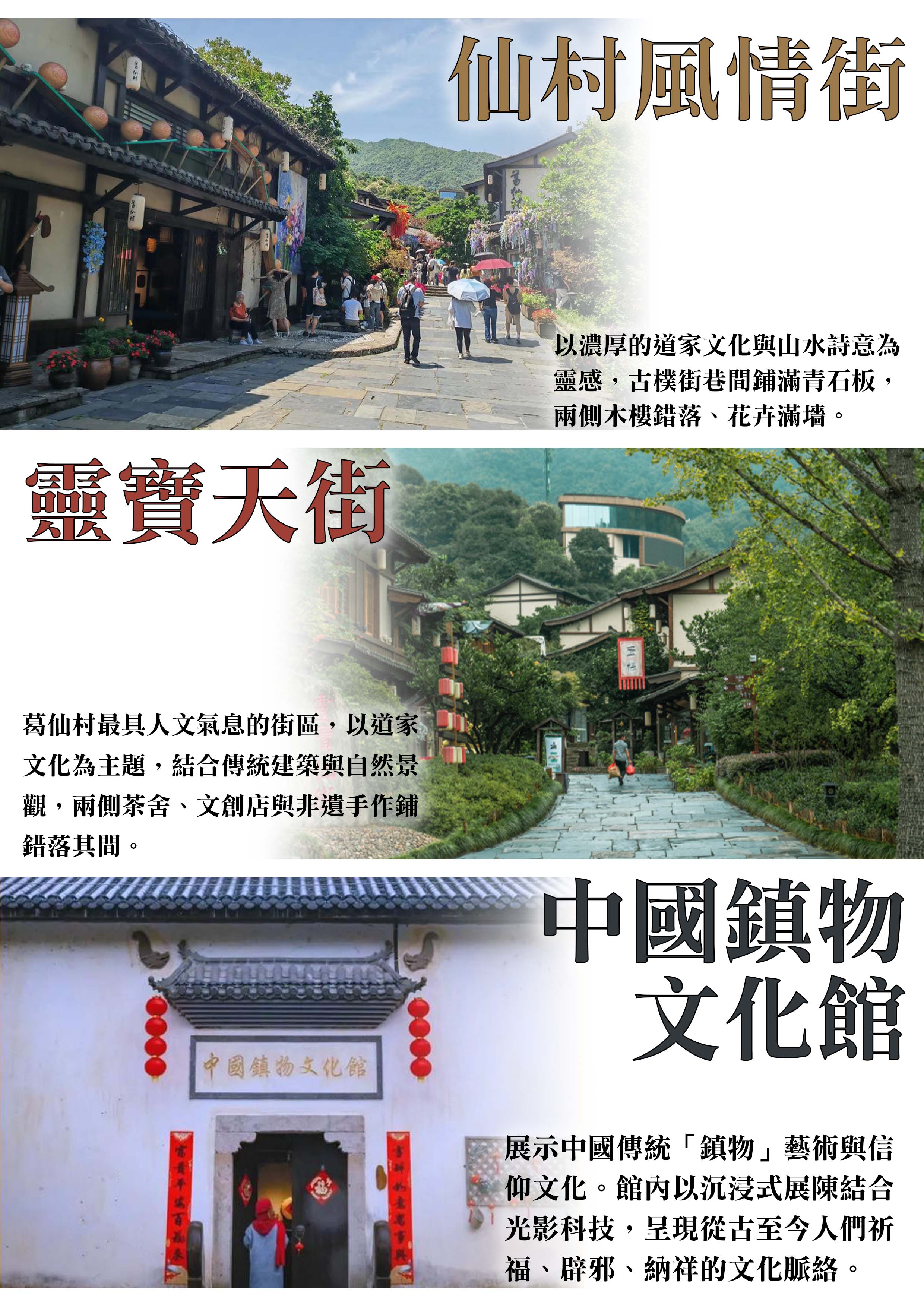 【仙村風情街】仙村風情街以濃厚的道家文化與山水詩意為靈感,古樸街巷間鋪滿青石板,兩側木樓錯落、花卉滿墻。街上茶舍、文創小店、漢服體驗館林立,既有古韻亦具生活氣息。白日漫步於花影流轉之中,夜晚燈籠點亮街巷,展現葛仙村最具人間煙火氣的浪漫角落。