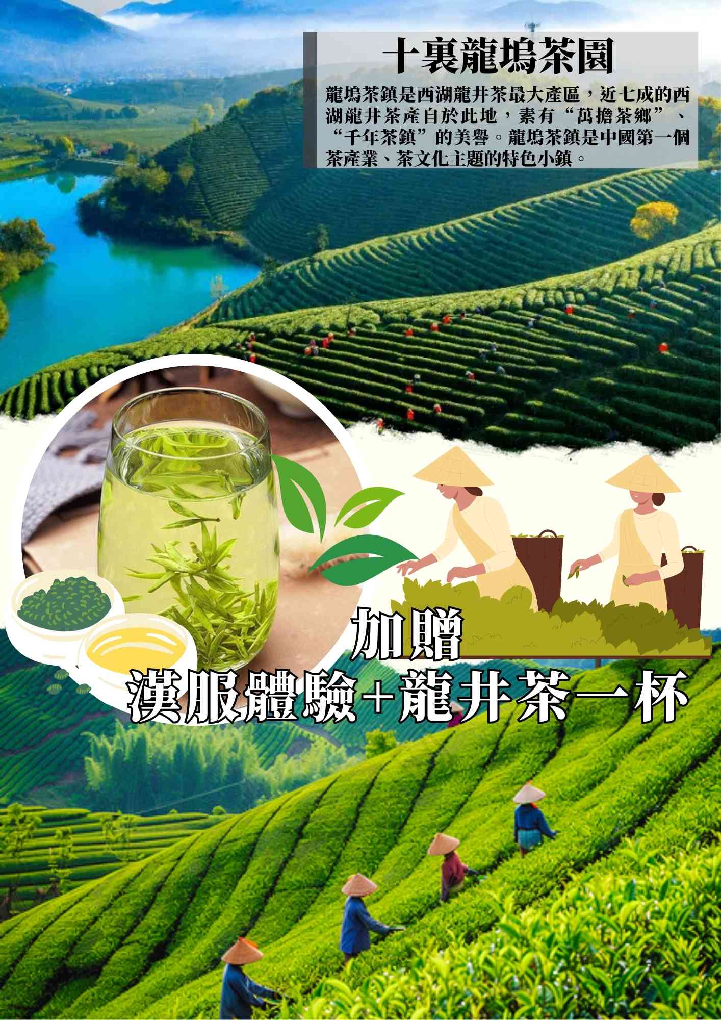 青山疊翠、茶香氤氳,漫步山巒間可聞清風拂過茶樹的細語,5A級旅遊景區標準的中國第一茶鎮以「中國第一茶鎮」之名蜚聲中外,為西湖龍井茶最主要產區之一。位於杭州西南,是首批浙江特色小鎮之一,以原龍塢鎮所在地葛衙莊社區為中心,輻射外桐塢、大清、上城埭、長埭、西湖茶場等十個村社,總面積達24.7平方公里。這裡山水相依,滿目皆翠,層層茶田如綠浪起伏,勾勒出西湖山系最柔美的曲線。春日採茶時節,清晨薄霧瀰漫,茶農身影穿梭其間,手中翻飛的嫩芽散發淡淡清香,構成最具詩意的田園畫卷。鎮內不僅有生態茶園、精品民宿、茶文化展示館,也能體驗製茶工藝、品茗閒談,感受江南山水間獨有的靜謐與悠然。★加贈小竹簍採茶&傳統採茶服體驗+龍井茶每人1杯