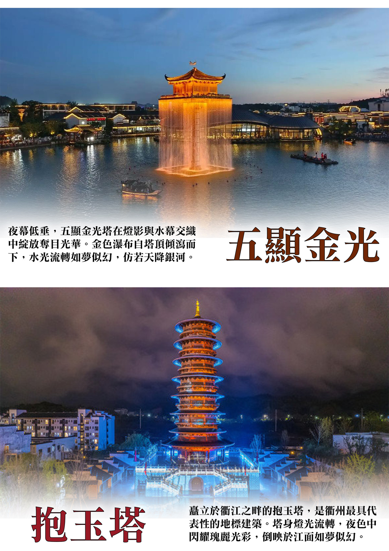 衢江水畔燈影搖曳,璀璨高塔直指夜空,光影交織間展現古城新姿【抱玉塔】矗立於衢江之畔的抱玉塔,是衢州最具代表性的地標建築。塔身燈光流轉,夜色中閃耀瑰麗光彩,倒映於江面如夢似幻。登塔遠眺,古城街巷與江岸燈火盡收眼底,氣勢壯麗而柔美。霓虹勾勒出塔身輪廓,映照出古韻與現代交融的風華,為衢州夜景增添一抹耀眼光彩。