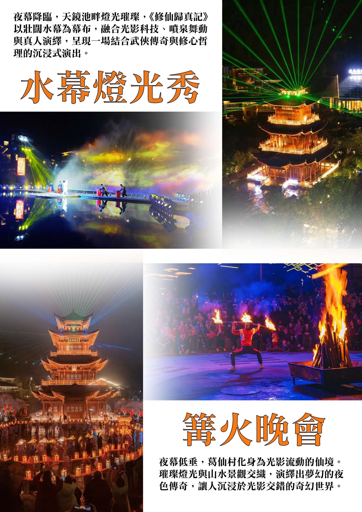 融合水幕投影、燈光特效與音樂劇場的沉浸式表演【水幕秀《修仙歸真記》】夜幕降臨,天鏡池畔燈光璀璨,《修仙歸真記》以壯闊水幕為幕布,融合光影科技、噴泉舞動與真人演繹,呈現一場結合武俠傳奇與修心哲理的沉浸式演出。水舞與火光交錯,音樂與特效交織,展現出如夢似幻的仙境盛景,令人嘆為觀止。整場演出以“修仙歸真、悟道修心”為主題,講述凡人歷經試煉、心性淬鍊最終成仙的故事。隨著光影流轉,霧氣、水幕與火焰變化出層層幻境,仿佛帶領觀眾步入修仙之境。結合葛仙山的道教文化意象與自然山水之美,使整個夜晚化為一場身心共鳴的奇幻旅程,為葛仙村之夜畫下最震撼而夢幻的篇章。