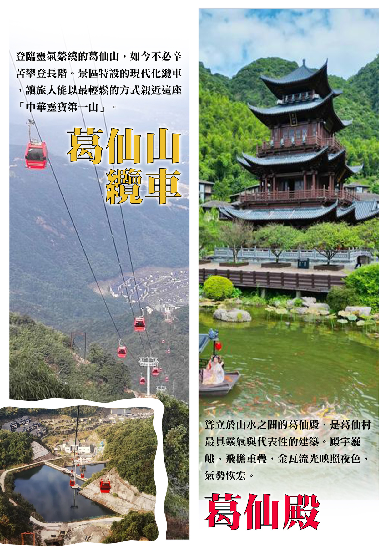 亞洲首條直接驅動客運架空索道【葛仙山纜車】登臨靈氣縈繞的葛仙山,如今不必辛苦攀登長階。景區特設的現代化纜車,讓旅人能以最輕鬆的方式親近這座「中華靈寶第一山」。車廂緩緩升起,越過蒼翠山巒與縈迴雲霧,腳下溪谷如畫、遠方峰巒疊翠。短短八分鐘便能從山腳直達山巔,將原本需步行一個多小時的路程化為一段悠然的空中旅程。,運行平穩、視野開闊,是欣賞葛仙山全貌的最佳方式。無論選擇乘纜登山或健行上行,都能在途中感受山水靈氣與道教聖境的神秘氣息,體驗凡塵與仙境之間的美妙距離。