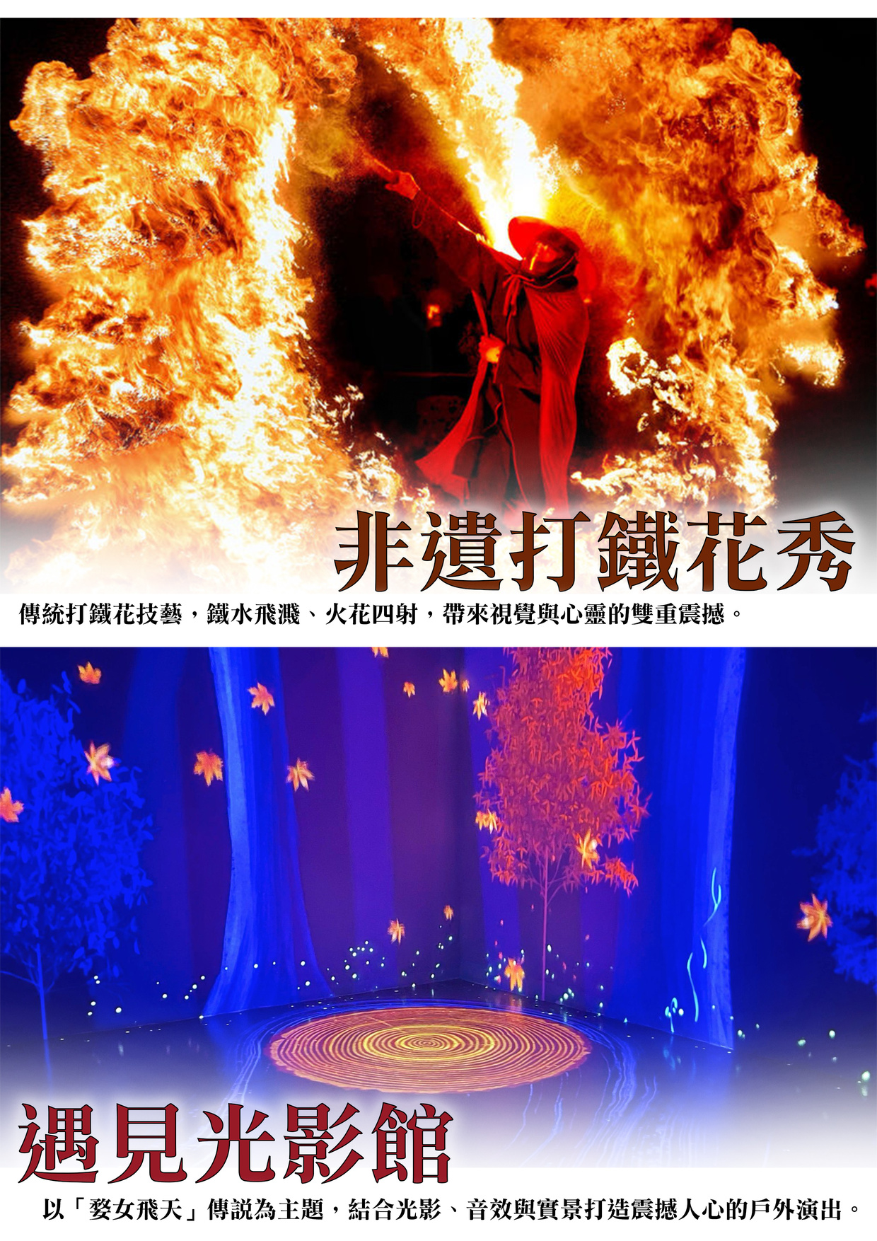【非遺打鐵花秀】這場精彩絕倫的非物質文化遺產表演,以傳統打鐵花技藝為主,鐵水飛濺、火花四射,瞬間點亮夜空,帶來視覺與心靈的雙重震撼。表演時間:每日兩場,分別為 20:00 與 21:10。