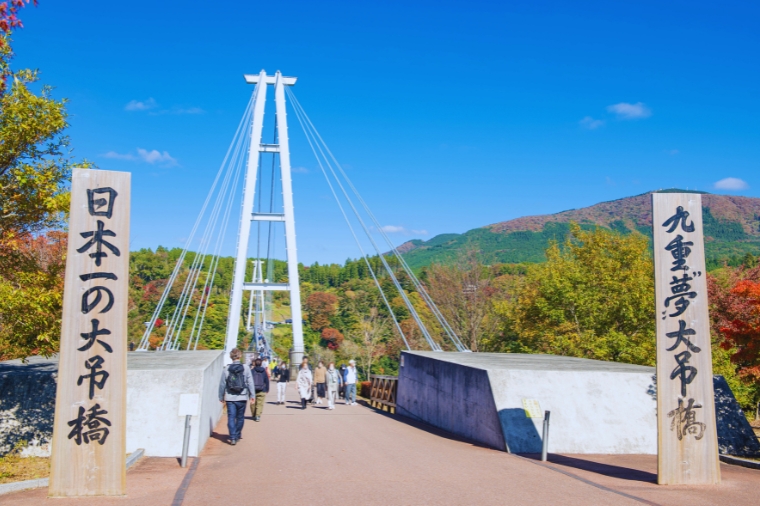 【九重夢大吊橋】九重夢大吊橋在春天賞櫻時節非常美麗。 橋的兩側種植著櫻花樹,盛開時,整個景區彷彿籠罩在粉色的雲海中,非常浪漫。 您可以一邊漫步在吊橋上,一邊欣賞九醉溪的壯麗景色和遠處的九重連山,同時還能欣賞到震動瀑布。