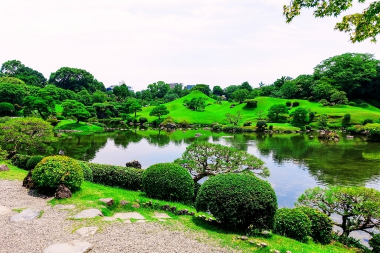 【水前寺成趣園】水前寺成趣園是肥後國熊本藩細川家的大名庭園。初代藩主忠利對這片清水潺潺湧出之地頗為喜愛,於1632年在此建造茶屋。之後第三代藩主綱利大建庭園,於1671年建成了一座桃山式的優美迴遊式庭園。取中國詩人陶淵明之《歸去來兮辭》,將其命名為「成趣園」。以阿蘇的伏流水湧出形成的約10,000㎡池塘為忠心,錯落有致地點綴著仿富士山建造的假山、松樹和浮石等,可以欣賞到四時不同的庭園美景。