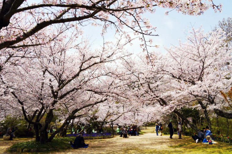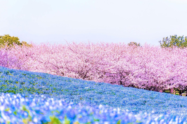 【海之中道海濱公園】在櫻花季時,約有1600棵櫻花樹盛開,特別是染井吉野櫻和大島櫻,沿著自行車道形成美麗的櫻花隧道,讓人彷彿走入童話世界。 此外,公園內的花之丘還會同時綻放約150萬株粉蝶花,藍色花海與櫻花相互輝映,形成獨特的視覺饗宴。