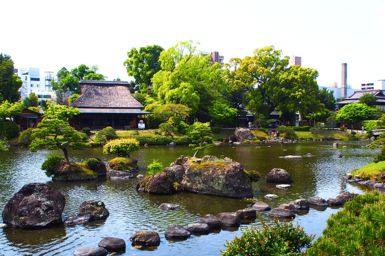 水前寺成趣園是肥後國熊本藩細川家的大名庭園。初代藩主忠利對這片清水潺潺湧出之地頗為喜愛,於1632年在此建造茶屋。之後第三代藩主綱利大建庭園,於1671年建成了一座桃山式的優美迴遊式庭園。取中國詩人陶淵明之《歸去來兮辭》,將其命名為「成趣園」。以阿蘇的伏流水湧出形成的約10,000㎡池塘為忠心,錯落有致地點綴著仿富士山建造的假山、松樹和浮石等,可以欣賞到四時不同的庭園美景。