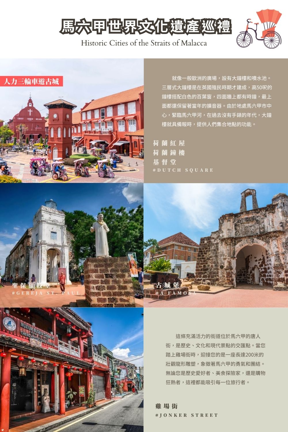 銜接東西方貿易必經之地,世界文化遺產巡禮【馬六甲】位於馬來半島西岸隔海望向印尼蘇門答臘,是馬來西亞歷史最悠久的城市之一。15 世紀時建立馬六甲王朝,成為連結中國、印度、中東與歐洲的重要貿易港口。因其戰略地位突出,先後被葡萄牙、荷蘭與英國統治,各時期留下的建築、宗教與生活方式交織出多層文化面貌。走進馬六甲,可看到紅色殖民建築、古堡遺跡、古老教堂與華人聚落並存,街道裡保留南洋與中華文化融合的生活景象。當地獨具風味的娘惹文化與傳統商行,也在今日的古城中延續。整座城市充滿歷史沉澱,是感受馬來西亞多元文化的最佳窗口。