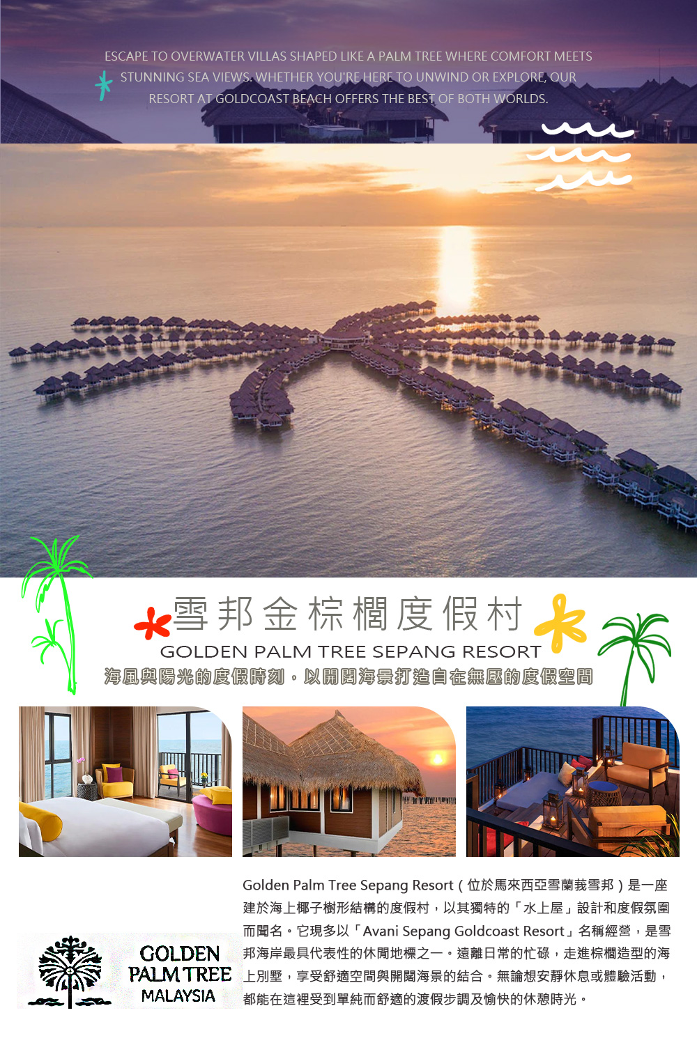 【黃金棕櫚海上渡假村】位於雪邦海岸,是以棕櫚樹造型延伸至海面的特色度假村,每間客房皆為海上木屋,推開房門即可看見開闊海景。房內空間寬敞,搭配南洋度假風格的木質設計,讓旅客能在寧靜環境中放鬆。園區內設施完整,擁有泳池、Spa、海景餐廳與休閒步道,非常適合安排半日或整日渡假。