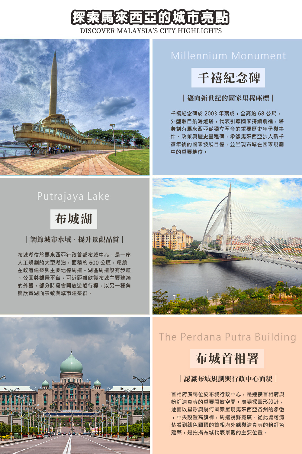 【未來太子城(粉紅清真寺、千禧紀念碑、布城湖、首相府廣場)這座綠意盎然的未來城市,是馬來西亞在不花公帑的前提下,於森林開發區打造出的行政電子中心。以首任總理命名,全區佔地達264平方公里,是一座無煙、永續、智慧並重的新興城市。4.2公里的林蔭大道,兩旁樹木成排,是國慶與閱兵遊行的主場。園區內不僅有首相官邸,還有親水公園、水上粉紅清真寺等地標建築,讓人感受現代城市與自然的完美共融。