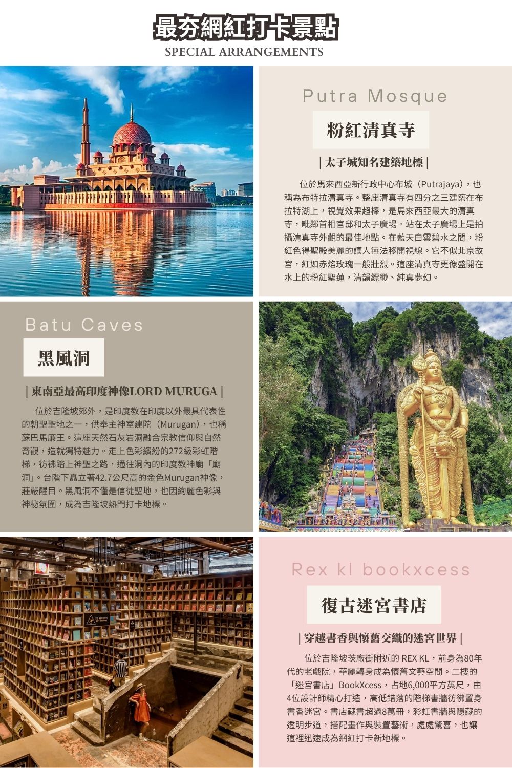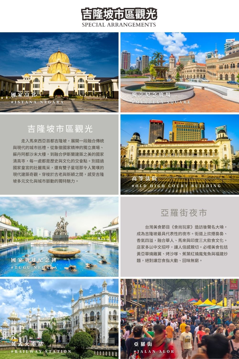 【吉隆坡市區觀光】走入馬來西亞首都吉隆坡,展開一段融合傳統與現代的城市巡禮。從象徵國家精神的獨立廣場、蘇丹阿都沙末大樓,到融合伊斯蘭建築之美的國家清真寺,每一處都是歷史與文化的交會點。別錯過國家皇宮的壯麗風采,還有雙子星塔那令人驚嘆的現代建築奇觀。穿梭於古老與新穎之間,感受吉隆坡多元文化與城市脈動的獨特魅力。
