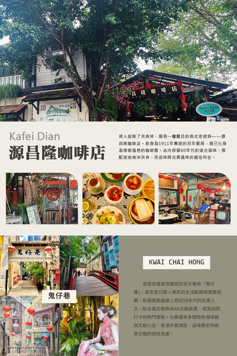 【源昌隆百年郵局】唐人街除了美真林,還有一幢醒目的英式老建築——源昌隆咖啡店。前身為1911年興建的百年郵局,現已化身為懷舊風格的咖啡館。店內保留60年代的復古韻味,搭配道地南洋美食,是品味時光與風味的絕佳所在。