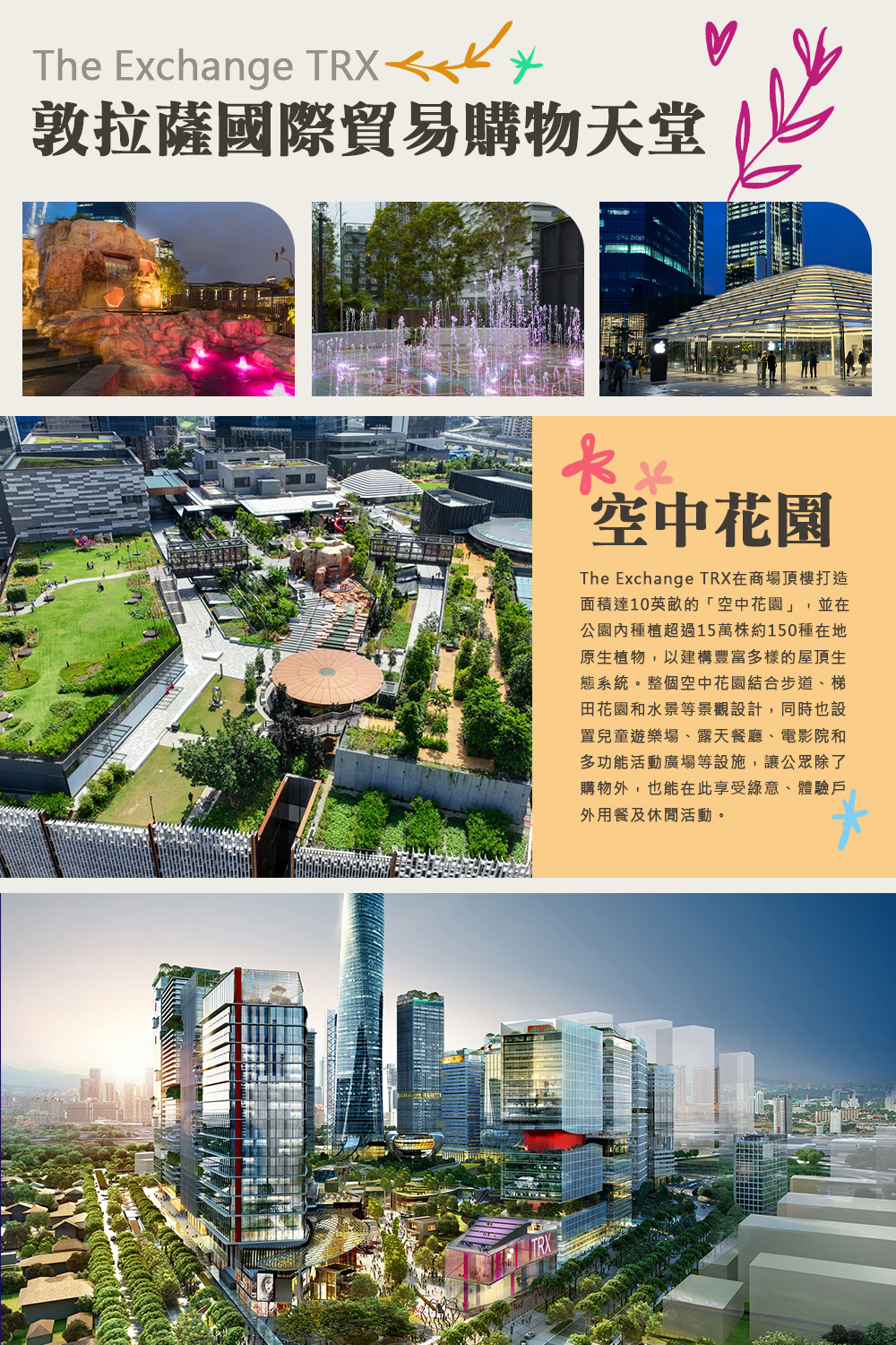 【敦拉薩國際貿易購物廣場THE EXCHANGE TRX(2023年全新地標購物中心)】以「公園裡的購物中心,購物中心裡的公園」為設計理念,自2023年底開幕後迅速成為吉隆坡最新地標。商場樓高五層,總面積220萬平方英尺,匯聚超過400間品牌店鋪,包括Apple Store、西武百貨、Shake Shack、Gentle Monster、喜茶等,還有LV、香奈兒、Uniqlo、無印良品等旗艦店。商場結合佔地10英畝的空中花園,擁有超過15萬棵本地植物與多樣景觀,打造綠意盎然的開放式購物體驗,一站滿足購物、美食與休閒娛樂。