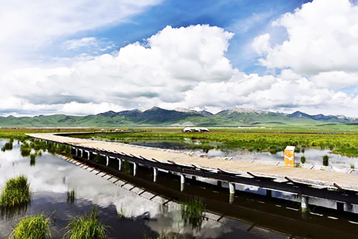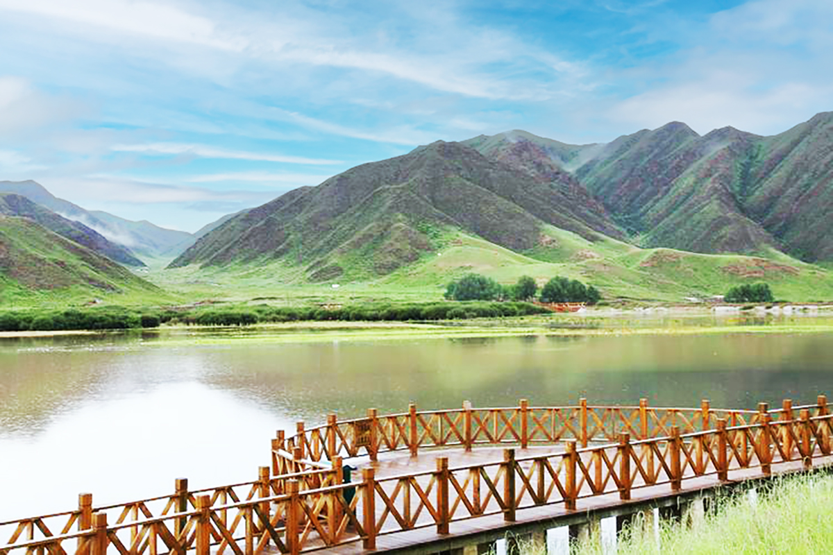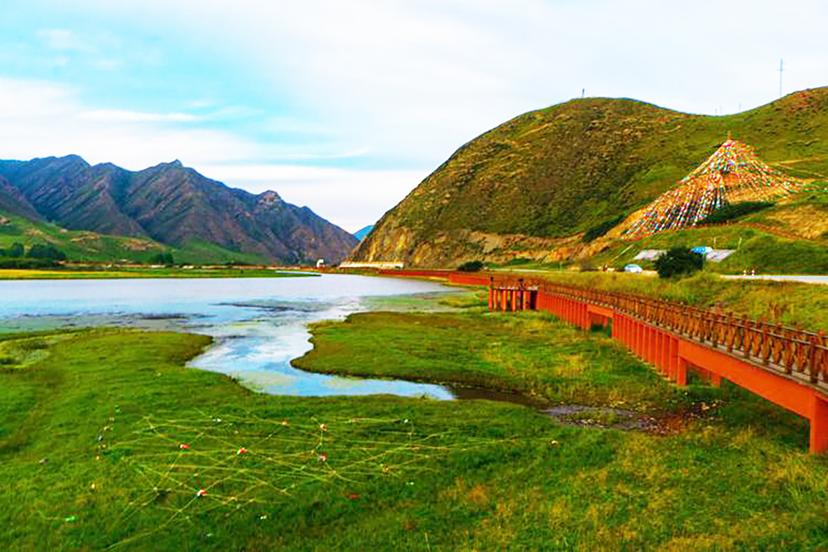 海拔約3480米,是甘肅省最大的高原淡水湖,被譽為“高原神湖”。湖水清澈如鏡,倒映著藍天白雲與遠山經幡,靜謐中透著神聖。四周草原遼闊,沼澤濕地環繞,水草豐美,牛羊點綴其間,宛如一幅流動的油畫。