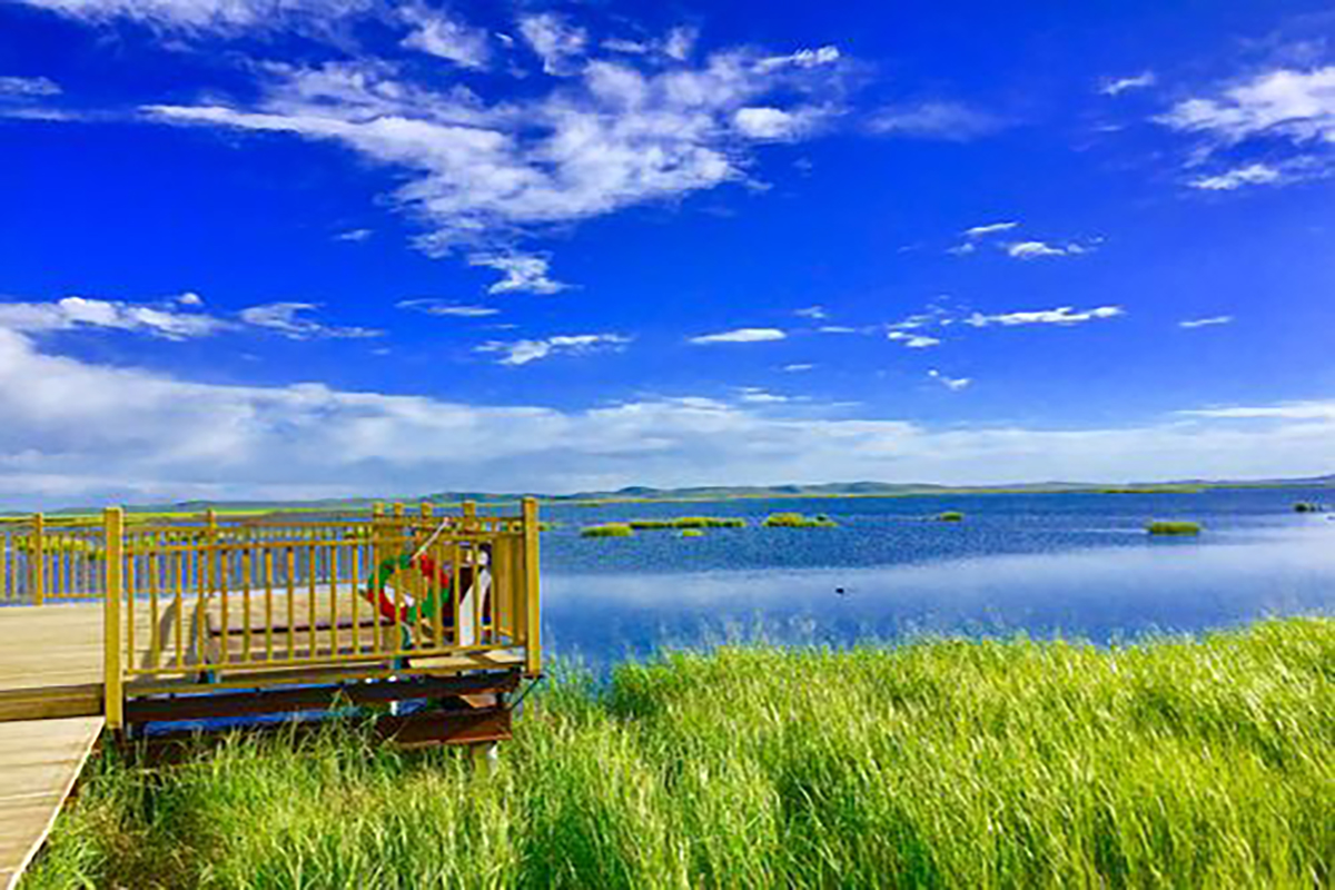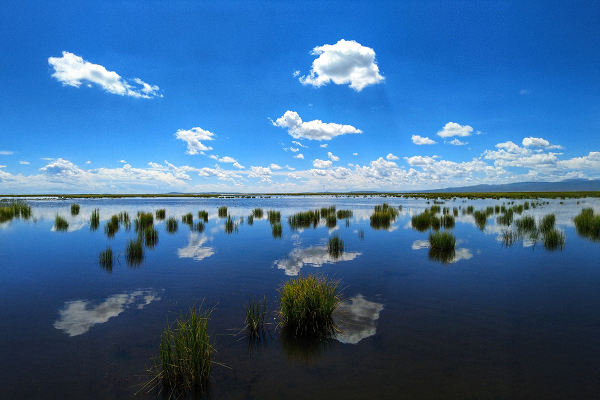 湖水澄澈如鏡,倒映著天地,分不清是雲在天上,還是雲落湖心。夏季,湖畔野花怒放,水底“塔松花”悄然綻放,將湖水染成淡淡的藕色,如少女羞澀的酡紅。秋冬時節,蘆葦金黃,水鳥翩躚,黑頸鶴掠過湖面,留下一串清鳴。