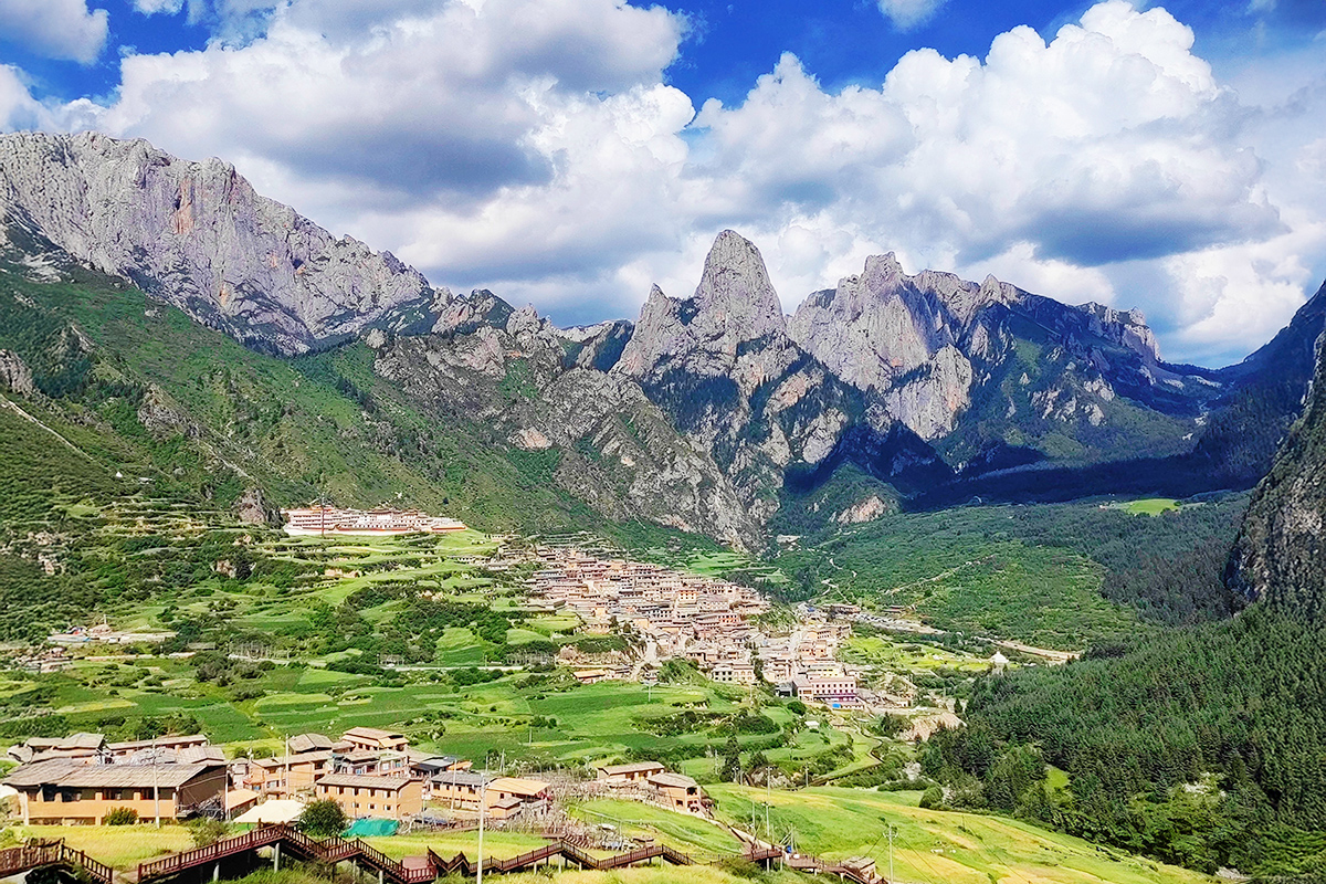 藏語“石匣子”,是甘南迭部縣深藏的天然石城。四座石峰環抱藏族村寨,雲霧繚繞間,拉桑寺金頂熠熠生輝。春來草甸新綠,野花點綴;夏日綠浪翻湧,雪山倒映;秋日層林盡染,麥浪金黃;冬季銀裝素裹,靜謐如畫。晨霧中,經幡輕舞,牧歌悠揚;暮色裡,炊煙嫋嫋,梵音低回。這裡,是洛克筆下的“伊甸園”,也是靈魂棲息的淨土。