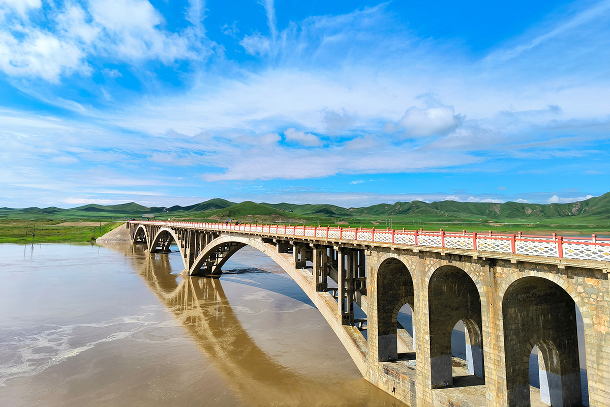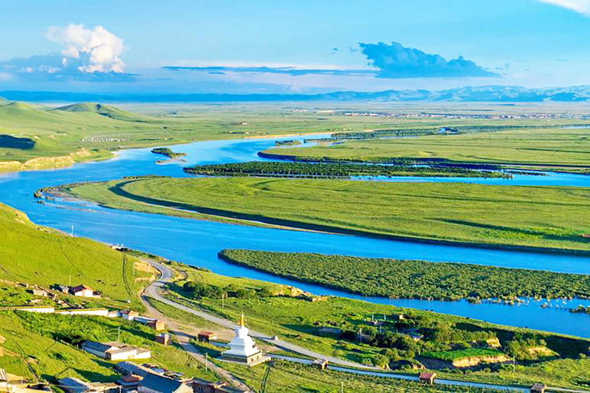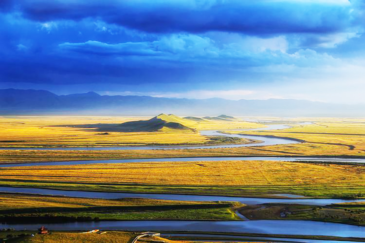 黃河九曲之首。河水自甘肅蜿蜒而來,在此形成"S"形大彎,宛如巨龍盤臥草原。夕陽下,金波蕩漾,與藍天白雲、綠草野花相映成趣,構成一幅壯美畫卷。這裡不僅是黃河的溫柔轉身,更是自然與人文交融的聖地。
