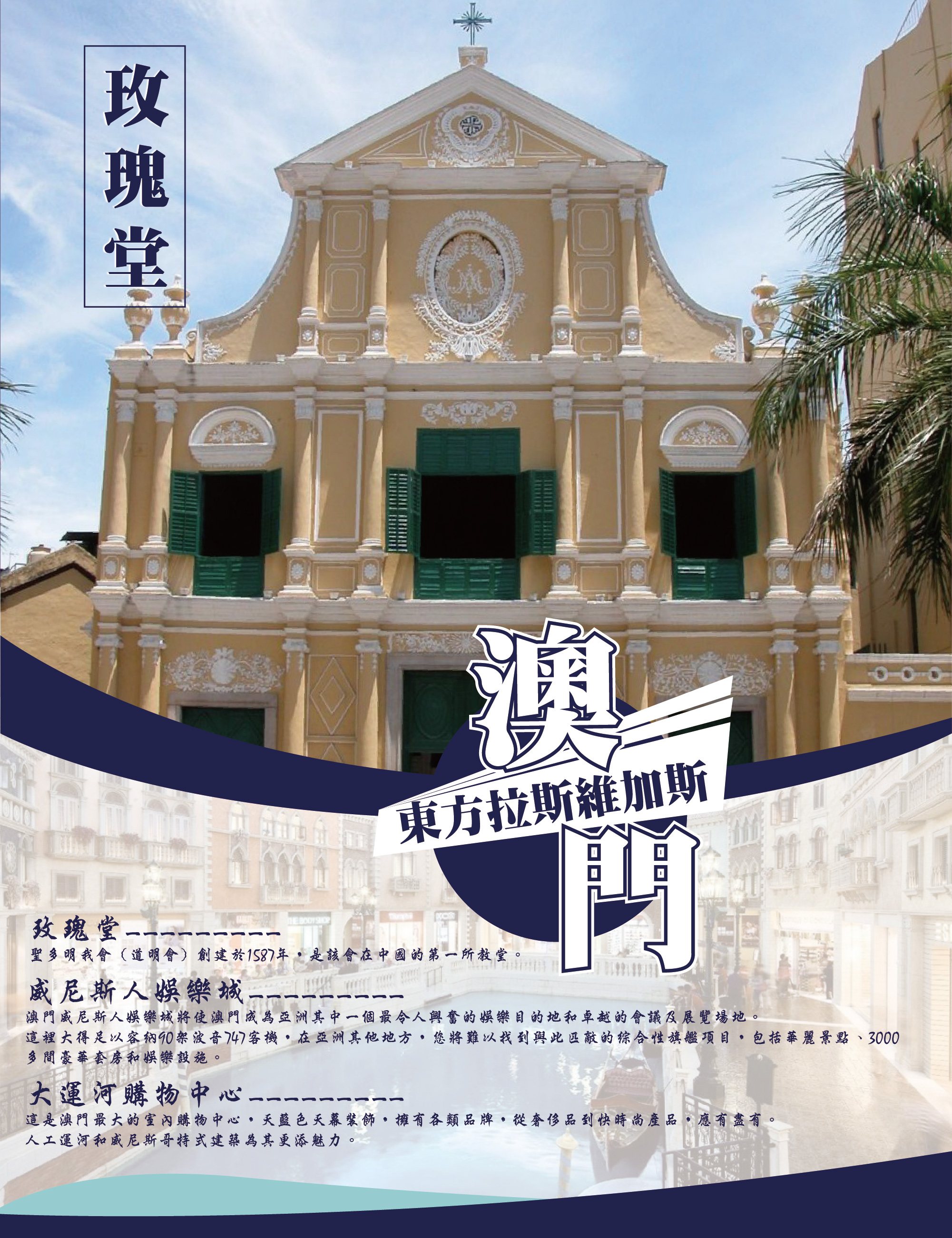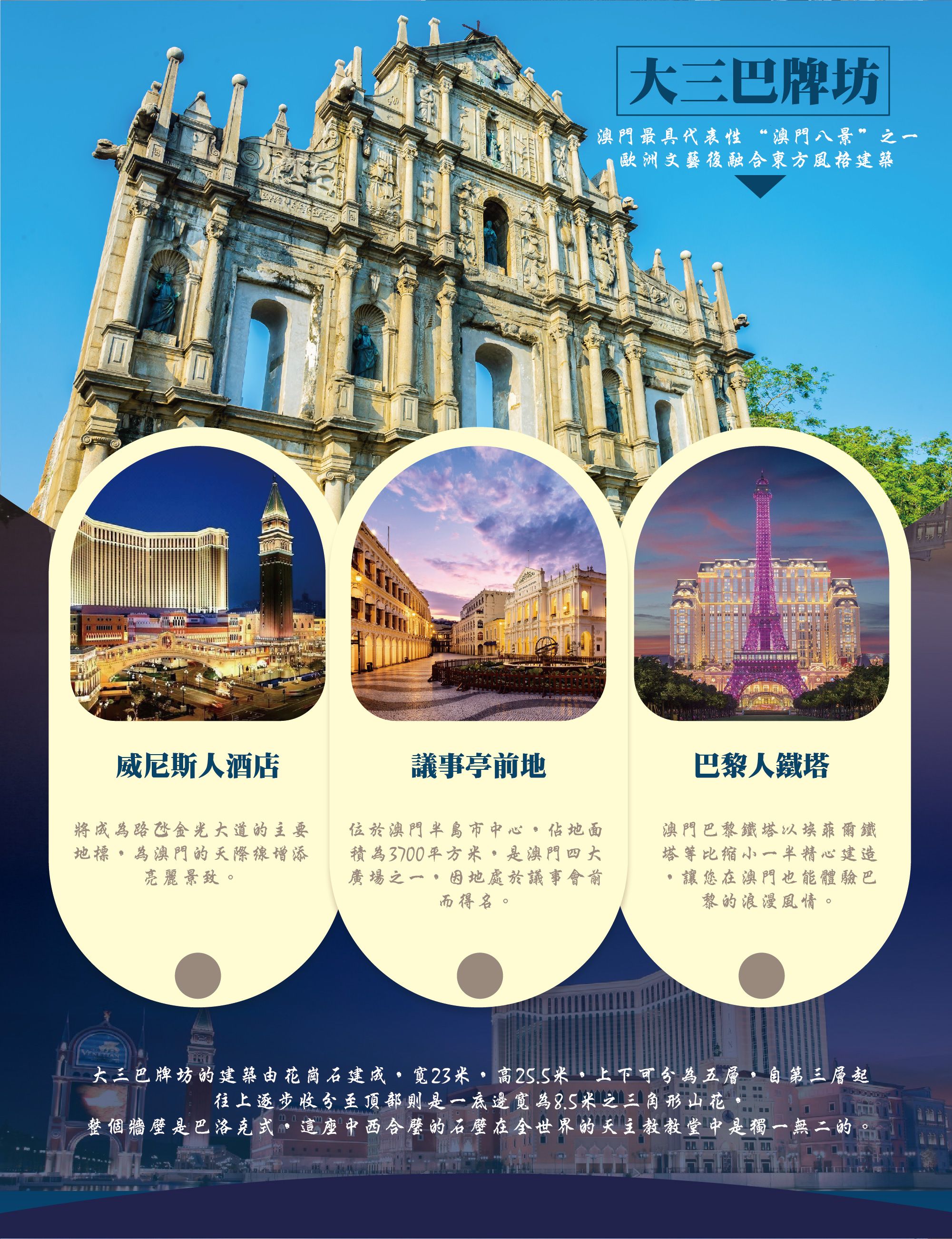 當日集合於機場,搭乘專機經由前往素有「東方小巴黎」之稱【澳門】澳門位於中國南部珠江口西側,是一個中西文化交融的迷人城市,歷史上曾為葡萄牙殖民地,保留了大量葡式建築與街道風貌,像是大三巴牌坊、議事亭前地及聖保祿教堂遺址,散發濃厚的歷史韻味;同時,媽閣廟等傳統華人廟宇也見證了澳門深厚的中國文化底蘊,漫步其間,既能感受歷史沉澱,又能體驗中西融合之美。