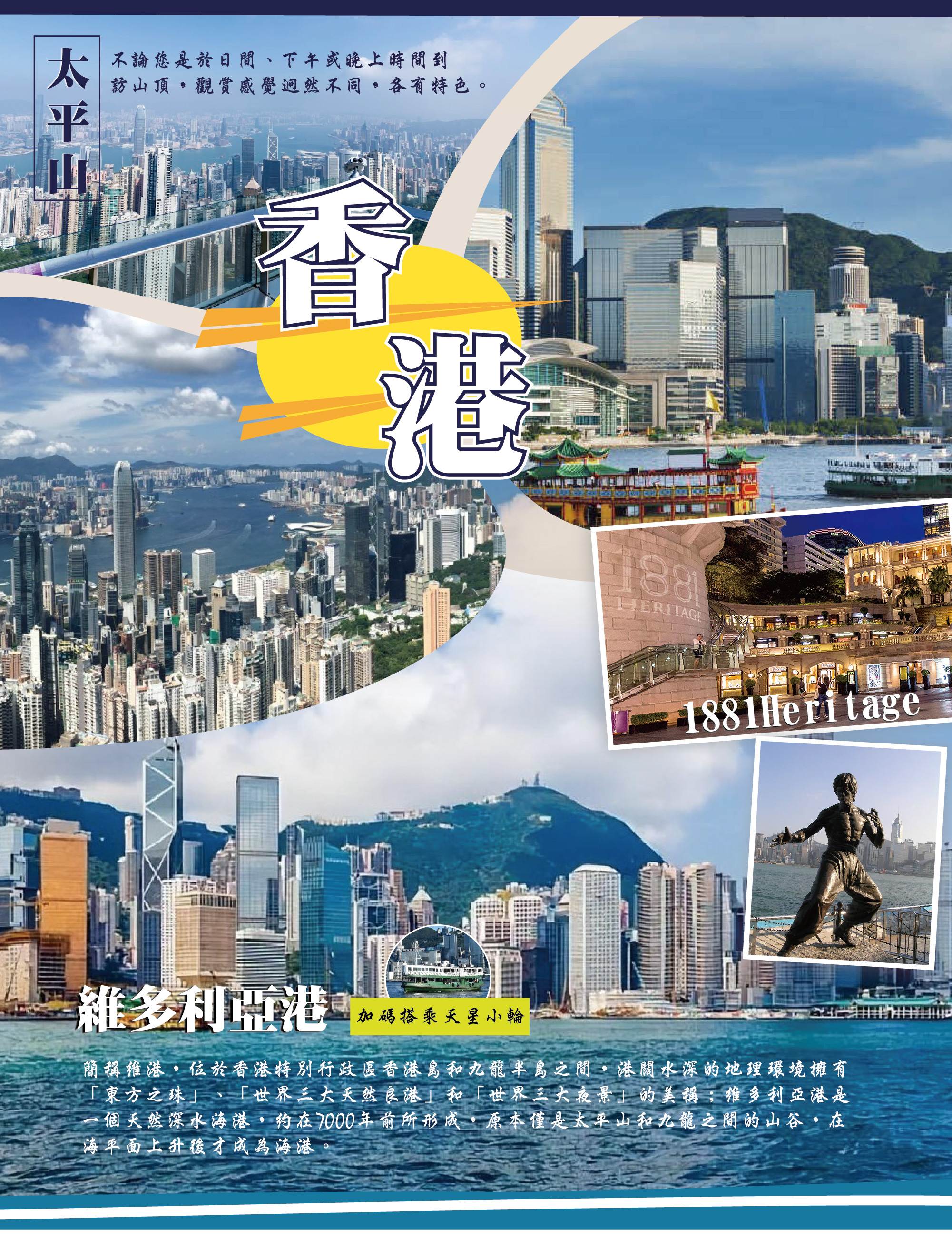 俯瞰維多利亞港的最佳位置【太平山觀景臺】太平山位於香港島,旅客可以一覽香港島、九龍半島與維多利亞港的壯麗景色。城市摩天大樓、繁忙港口和遠方海景交織成獨特的都市畫卷。白天登頂,可欣賞天際線、海灣與群山的自然景致;傍晚或夜晚,香港燈火通明,城市光影璀璨,形成迷人的夜景。太平山觀景臺不僅提供全景視野,也象徵香港的繁榮與活力,是旅客感受都市魅力、拍攝絕美照片的首選地點。觀景臺周邊配套完善,交通便利,適合所有年齡層旅客參觀。