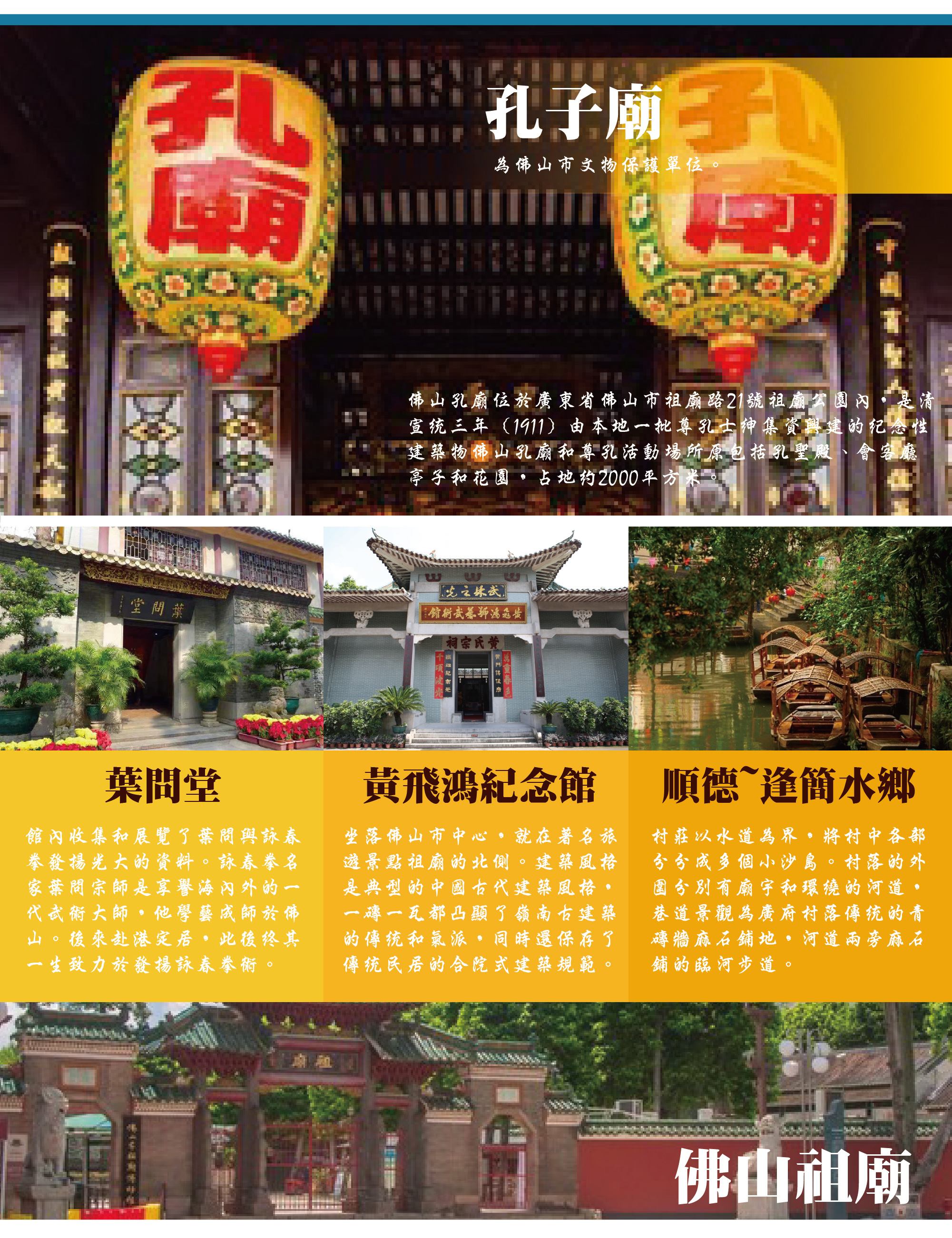 建築風格融合嶺南特色與現代設計【葉問堂】是為紀念詠春拳宗師葉問而設的文化景點,館內展示葉問生平、詠春拳術及武術傳承。葉問堂透過展板、實物及互動設施,讓旅客深入了解葉問在中國武術史上的地位及其對現代詠春拳的影響。館內氛圍莊重,展現武術文化的厚重底蘊。葉問堂不僅是武術愛好者的朝聖地,也是一般旅客了解佛山武術文化、感受嶺南傳統精神的理想場所,透過參觀可獲得深刻的人文啟發。