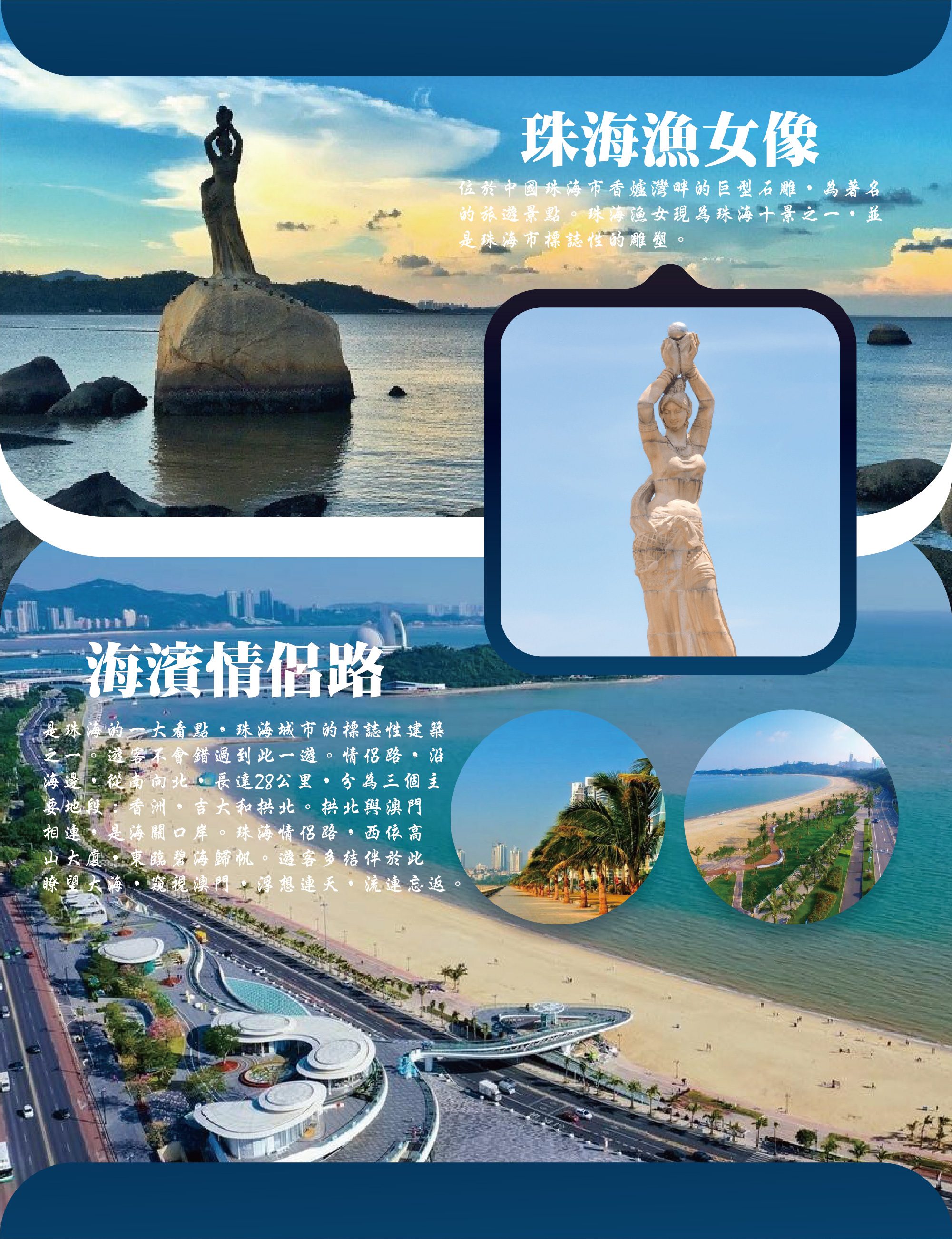 認識珠海人文底蘊重要象徵【珠海漁女雕像(遠眺)】是珠海最具代表性的城市地標,佇立於海岸岩石之上,象徵勤勞、純樸與幸福的祝福。漁女手捧明珠,面向大海,造型優雅,與周圍海景相互呼應,成為無數旅客必拍的經典畫面。雕像背後蘊含當地漁民文化與傳說故事,代表珠海從漁村發展成現代城市的歷史脈絡。此地不僅具有觀光價值,也承載珠海的城市精神,無論日間或夜晚,漁女雕像與海景相映成趣,令人留下深刻印象。