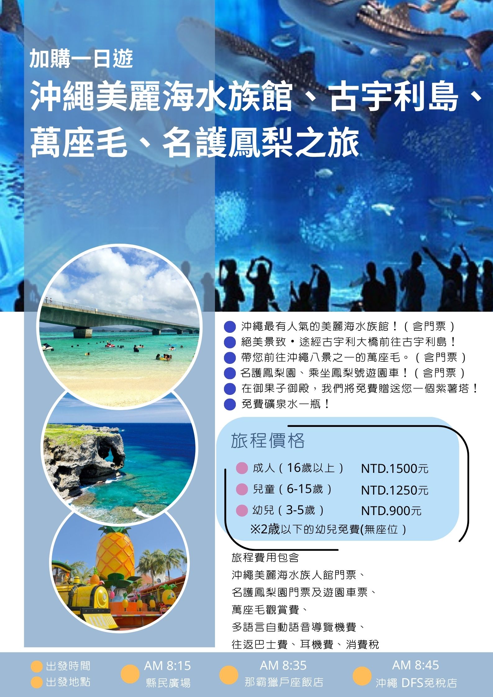 今日集合於桃園國際機場,辦理出國手續後,即搭乘豪華客機飛往日本最南端-有日本夏威夷之稱的島嶼,琉球群島-沖繩。歡樂時光隨即展開。