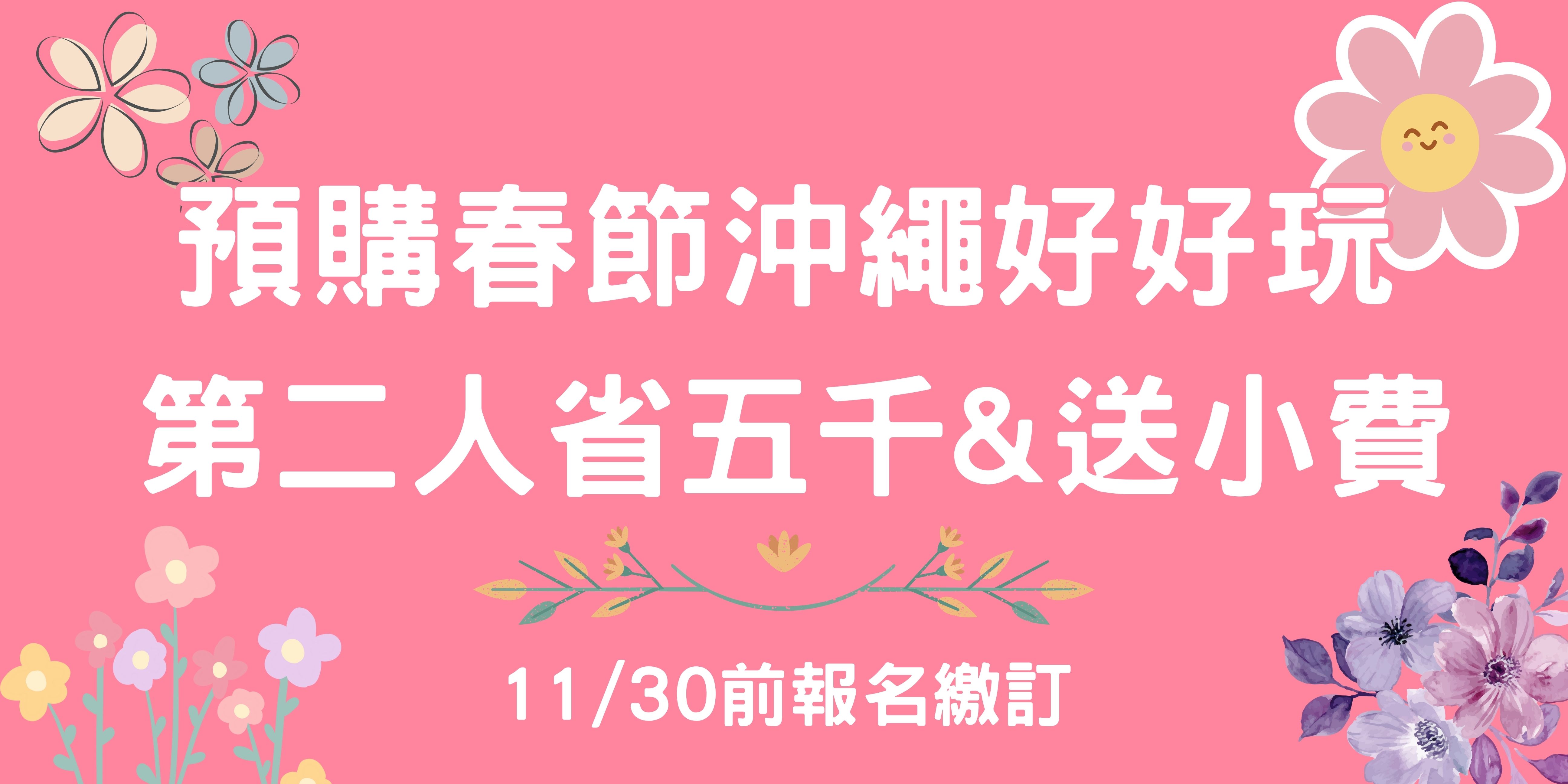 2026/02/16(一) | 桃園國際機場出發 《春節沖繩好好玩》HI翻沖繩四日~海洋博.美國村.名護鳳梨園.玉泉洞(媽媽免煮年夜飯)機位 16 候補0 已售6 可售9★第二人省五仟&送小費★媽媽免煮年夜飯 |