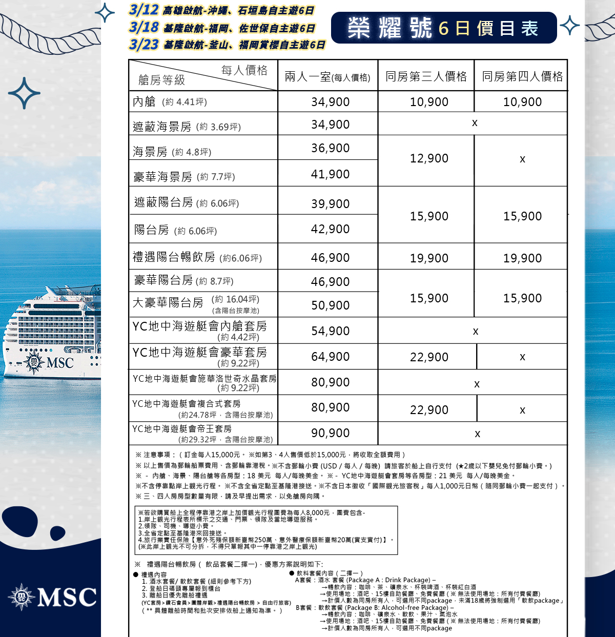 2.本商品性質為自由行,恕無領隊隨程服務,船上所有服務皆由MSC地中海郵輪-榮耀號提供。