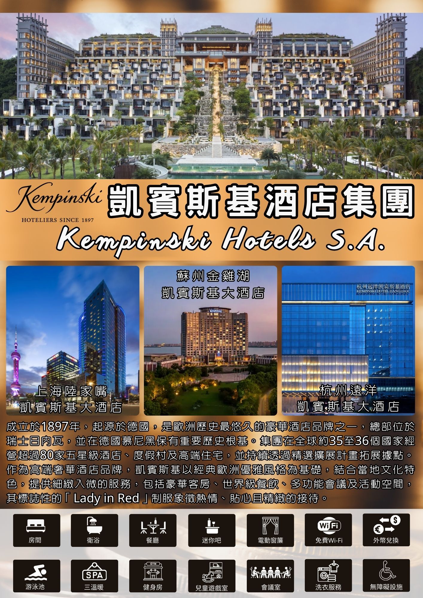 傳承超過百年的【凱賓斯基酒店集團(Kempinski Hotels)】成立於1897年,起源於德國,是歐洲歷史最悠久的豪華酒店品牌之一,總部位於瑞士日內瓦,並在德國慕尼黑保有重要歷史根基。集團在全球約35至36個國家經營超過80家五星級酒店、度假村及高端住宅,並持續透過精選擴展計畫拓展據點。作為高端奢華酒店品牌,凱賓斯基以經典歐洲優雅風格為基礎,結合當地文化特色,提供細緻入微的服務,包括豪華客房、世界級餐飲、多功能會議及活動空間,其標誌性的「Lady in Red」制服象徵熱情、貼心且精緻的接待。集團在歐洲、亞洲、中東、非洲及美洲皆有布局,亞洲市場自1992年北京首家酒店開業後快速發展,而在全球擴張中,凱賓斯基強調精選而非大量擴張,確保每家酒店均符合奢華服務與文化融合標準。品牌精神強調「旅遊中的藝術與表現」,致力於將住宿、設計、歷史、美食及當地文化結合,為旅客打造難忘的高端體驗。