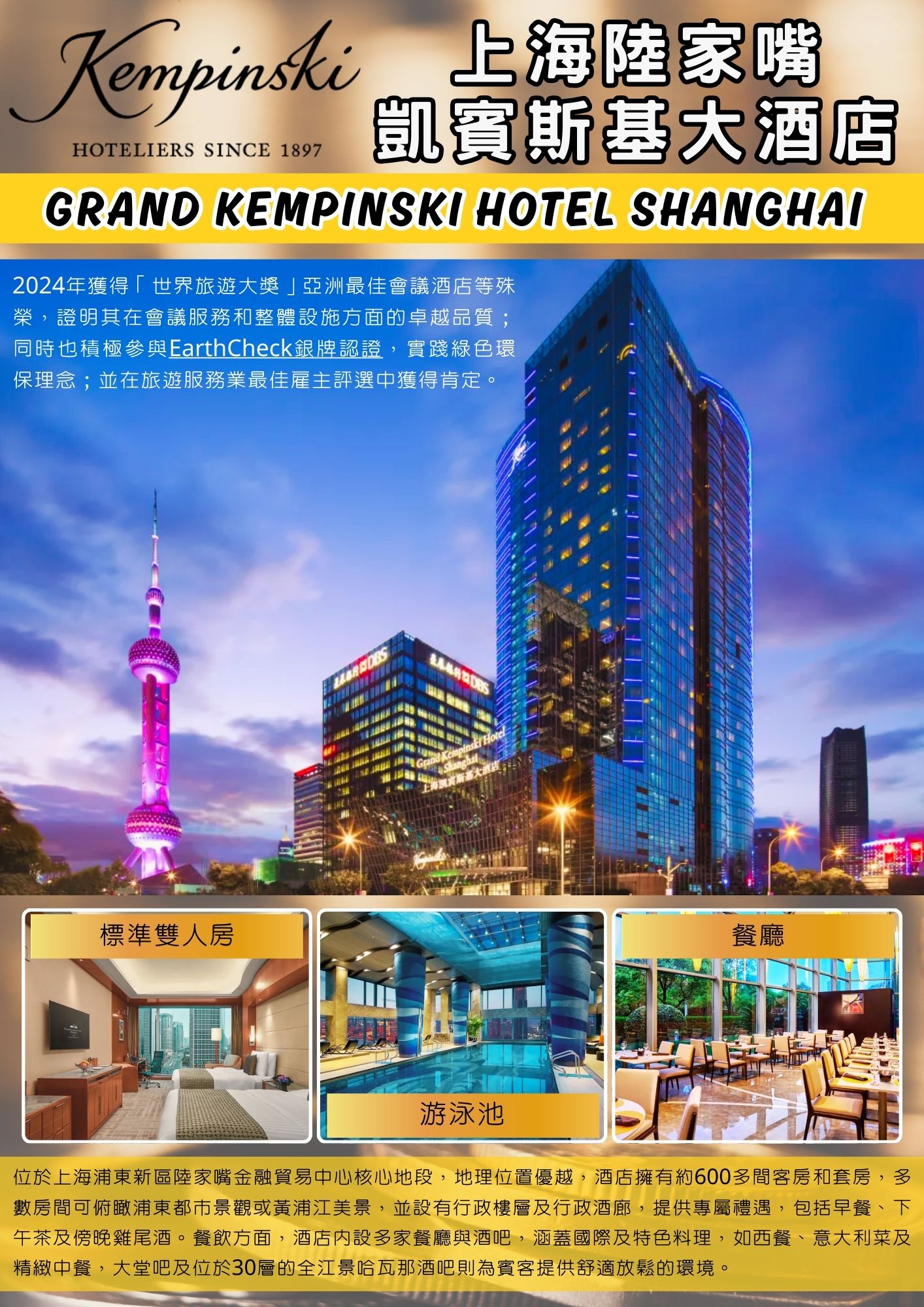 本日特別安排入住【上海陸家嘴凱賓斯基大酒店(Grand Kempinski Hotel Shanghai)】位於上海浦東新區陸家嘴金融貿易中心核心地段,地理位置優越,周邊環繞東方明珠塔、金茂大廈及上海中心大廈等地標,步行即可到達黃浦江濱江步道與地鐵站,交通十分便利。酒店擁有約600多間客房和套房,多數房間可俯瞰浦東都市景觀或黃浦江美景,並設有行政樓層及行政酒廊,提供專屬禮遇,包括早餐、下午茶及傍晚雞尾酒。餐飲方面,酒店內設多家餐廳與酒吧,涵蓋國際及特色料理,如西餐、意大利菜及精緻中餐,大堂吧及位於30層的全江景哈瓦那酒吧則為賓客提供舒適放鬆的環境。商務與會議設施完善,包括可容納多達720人的無柱大宴會廳及多間靈活會議室,適合舉辦大型宴會、會議及婚禮等活動。休閒設施亦一應俱全,擁有室內游泳池、30層高層水療中心及健身中心,賓客可在此俯瞰上海都市景致,享受身心放鬆的體驗。酒店地處浦東商務與觀光熱點,距離外灘、南京路步行街等上海著名景點僅需數分鐘車程,浦東及虹橋兩大機場約45分鐘車程內,無論商務或旅遊皆極為便利。
