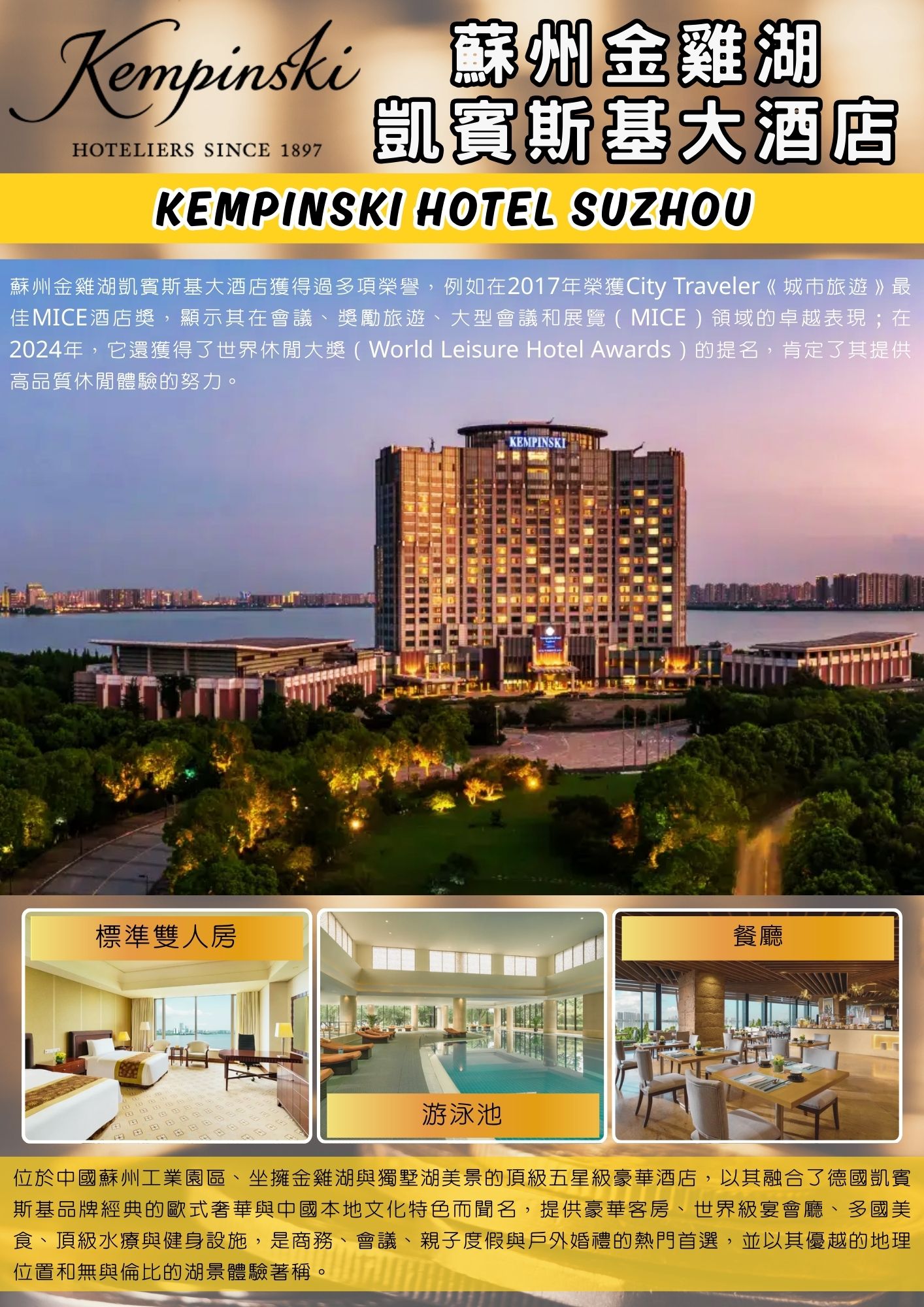 本日特別安排入住【蘇州金雞湖凱賓斯基大酒店(Kempinski Hotel Suzhou)】位於中國蘇州工業園區、坐擁金雞湖與獨墅湖美景的頂級五星級豪華酒店,以其融合了德國凱賓斯基品牌經典的歐式奢華與中國本地文化特色而聞名,提供豪華客房、世界級宴會廳、多國美食、頂級水療與健身設施,是商務、會議、親子度假與戶外婚禮的熱門首選,並以其優越的地理位置和無與倫比的湖景體驗著稱。