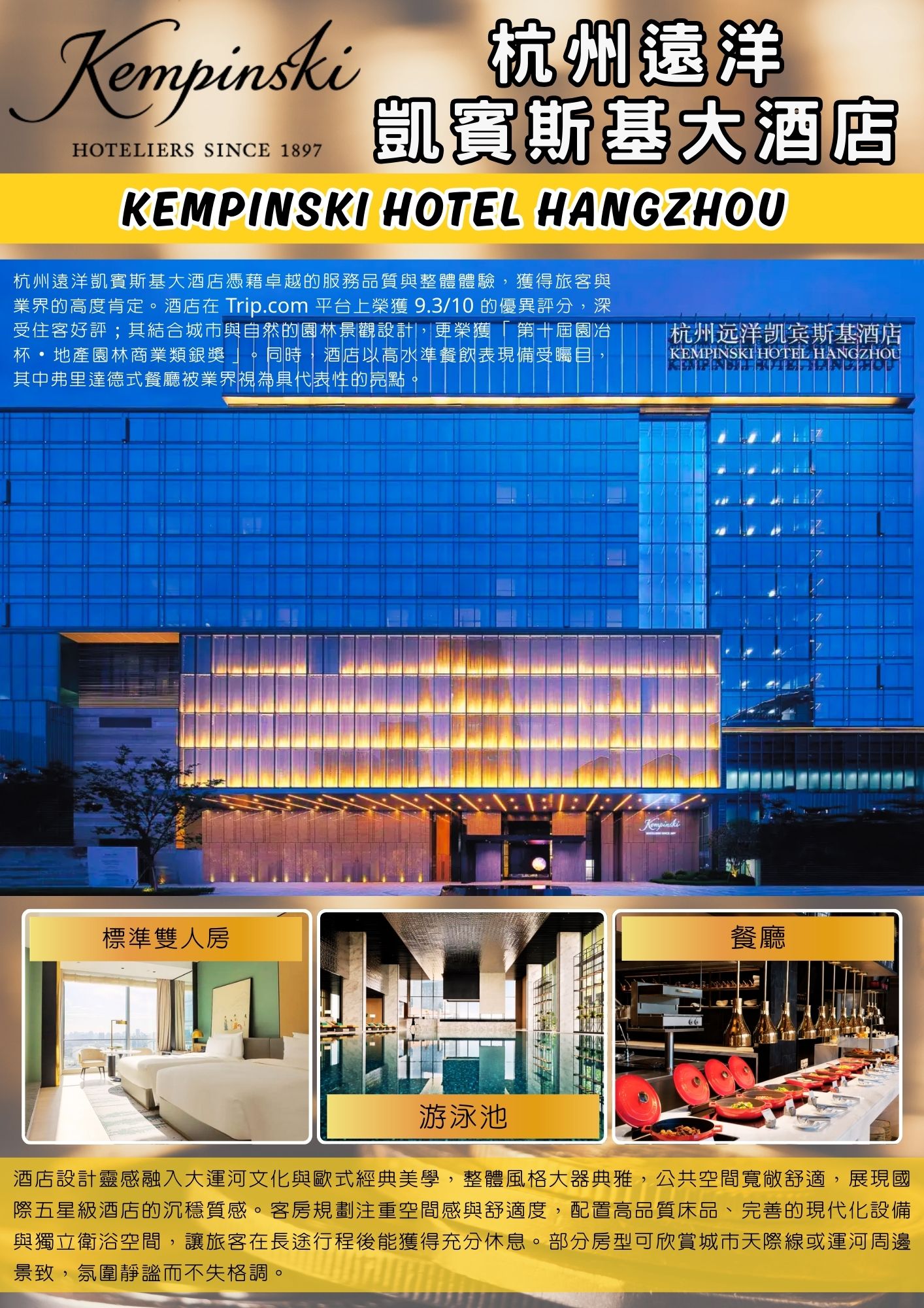 【杭州遠洋凱賓斯基大酒店】坐落於杭州核心商業區,鄰近京杭大運河,兼具城市便利與人文底蘊。酒店設計靈感融入大運河文化與歐式經典美學,整體風格大器典雅,公共空間寬敞舒適,展現國際五星級酒店的沉穩質感。客房規劃注重空間感與舒適度,配置高品質床品、完善的現代化設備與獨立衛浴空間,讓旅客在長途行程後能獲得充分休息。部分房型可欣賞城市天際線或運河周邊景致,氛圍靜謐而不失格調。館內餐飲設施多元,結合中式風味與西式料理,餐食品質穩定,適合團體旅客用餐需求。酒店亦設有健身中心與室內泳池,提供旅途中放鬆身心的休閒選擇。