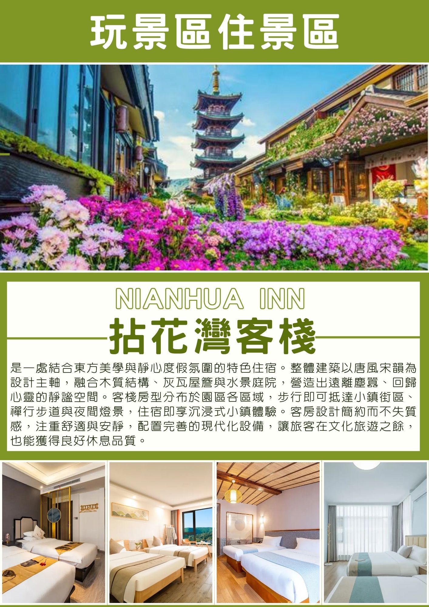 本日特別安排~玩景區住景區【拈花灣客棧】是一處結合東方美學與靜心度假氛圍的特色住宿。整體建築以唐風宋韻為設計主軸,融合木質結構、灰瓦屋簷與水景庭院,營造出遠離塵囂、回歸心靈的靜謐空間。客棧房型分布於園區各區域,步行即可抵達小鎮街區、禪行步道與夜間燈景,住宿即享沉浸式小鎮體驗。客房設計簡約而不失質感,注重舒適與安靜,配置完善的現代化設備,讓旅客在文化旅遊之餘,也能獲得良好休息品質。夜晚時分,小鎮燈光逐漸點亮,水岸與街巷映照出柔和光影,呈現拈花灣最具代表性的禪意夜景,為旅程增添難忘回憶。入住拈花灣客棧,不僅是住宿安排,更是一段融合自然、人文與心靈沉澱的體驗,特別適合安排於江南深度旅遊、文化主題行程或高質感慢活路線中,讓旅客真正放慢腳步,感受不一樣的旅行節奏。