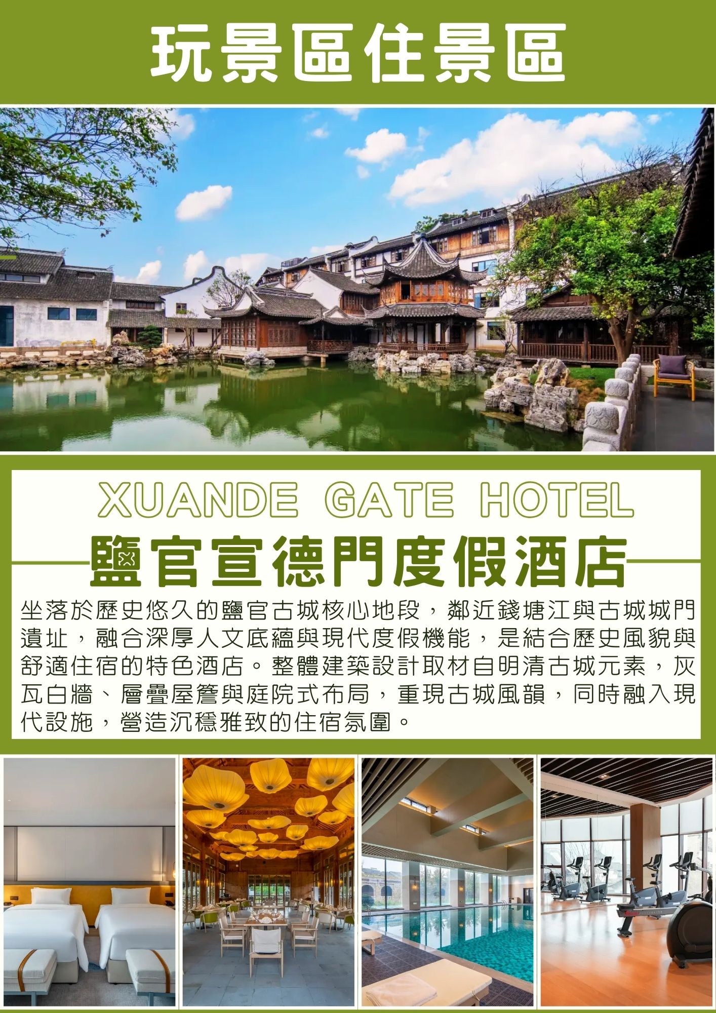 玩景區住景區【鹽官宣德門度假酒店(XUANDE GATE HOTEL)】坐落於歷史悠久的鹽官古城核心地段,鄰近錢塘江與古城城門遺址,融合深厚人文底蘊與現代度假機能,是結合歷史風貌與舒適住宿的特色酒店。整體建築設計取材自明清古城元素,灰瓦白牆、層疊屋簷與庭院式布局,重現古城風韻,同時融入現代設施,營造沉穩雅致的住宿氛圍。客房空間規劃舒適寬敞,採光良好,配置完善的現代化設備與高品質備品,讓旅客在文化行程之餘也能獲得良好休息品質。酒店公共空間延續古城意象,行走其中彷彿置身歷史場景,靜謐中帶有度假氛圍。
