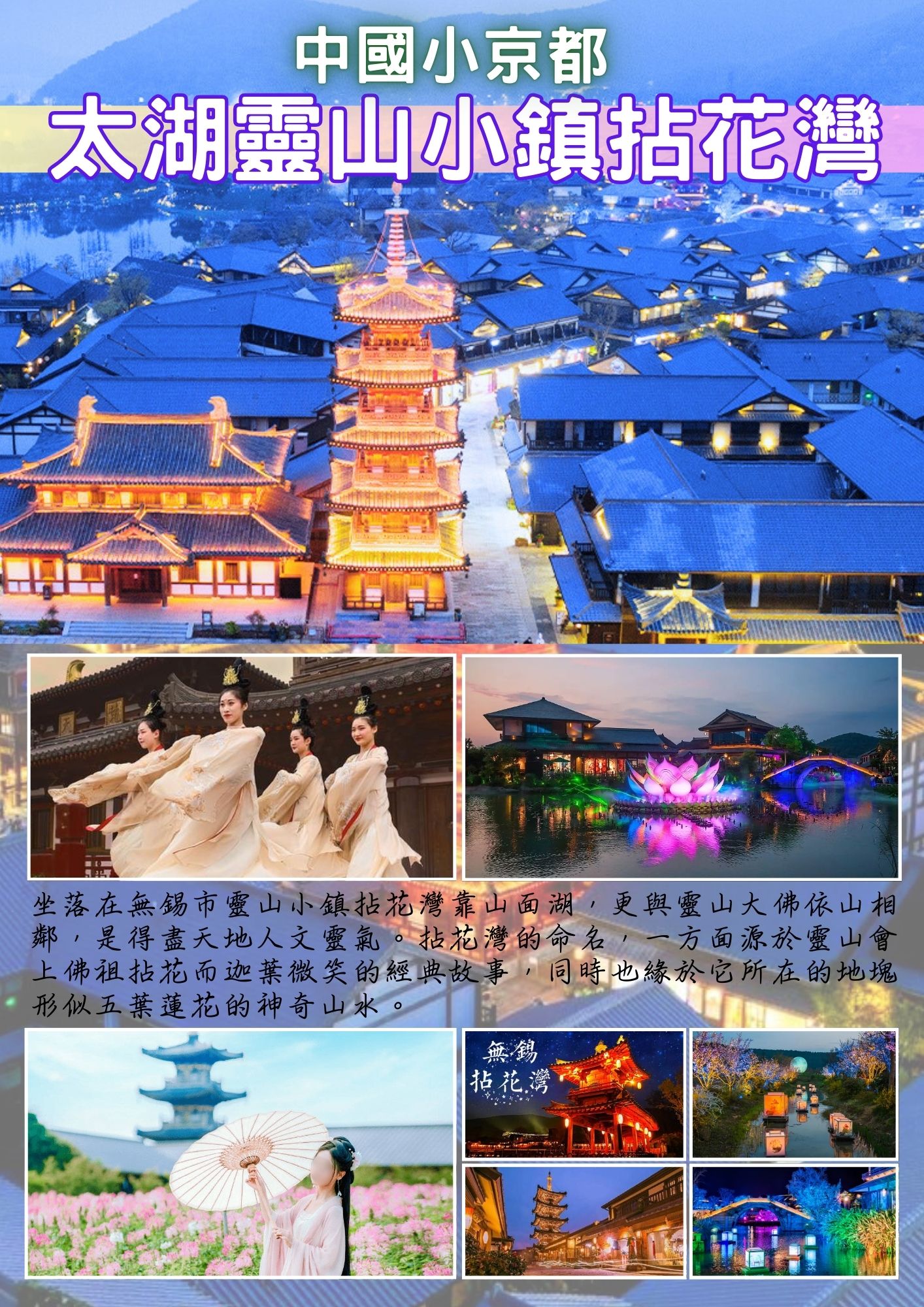 玩景區住景區【中國小京都~太湖靈山小鎮拈花灣】拈花灣是靈山集團歷時5年,繼梵宮之後又一精品力作。坐落在無錫市靈山小鎮拈花灣靠山面湖,更與靈山大佛依山為鄰,可以說是得盡天地人文靈氣。拈花灣的命名,一方面源於靈山會上佛祖拈花而迦葉微笑的經典故事,同時也緣於它所在的地塊形似五葉蓮花的神奇山水。小鎮整體建築風格與日本奈良非常相似,又融入了中國江南小鎮特有的水系,打造出了一種獨有的建築風格,使得整個小鎮沉浸在美輪美奐的意境中。