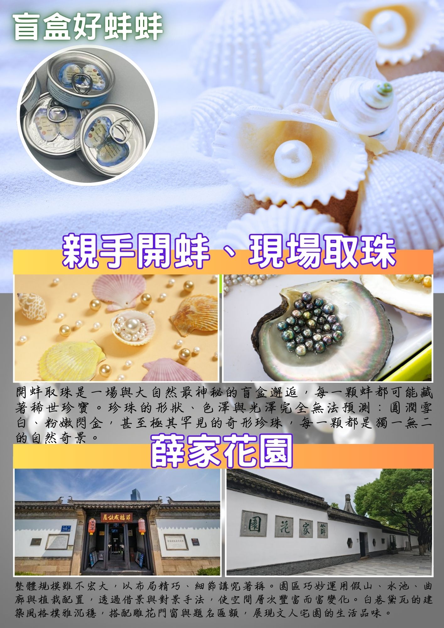 特別加碼~網紅新玩法【★盲盒好蚌蚌★親手開蚌、現場取珠】開蚌取珠是一場與大自然最神秘的盲盒邂逅,每一顆蚌都可能藏著稀世珍寶。珍珠的形狀、色澤與光澤完全無法預測:圓潤雪白、粉嫩閃金,甚至極其罕見的異形珍珠,每一顆都是獨一無二的自然奇蹟。敲開蚌殼的瞬間,彷彿揭開了天地精華凝結的秘密,令人屏息驚艷。這種互動體驗不僅充滿期待與驚喜,也讓人直觀感受珍珠形成的自然奇觀,每一顆珠子都承載了數年的歲月與水流精華。無論是圓滑如玉的經典珍珠,還是形態奇特、色彩斑斕的罕見之寶,都令人感受到大自然的巧奪天工與珍貴無比的魅力。