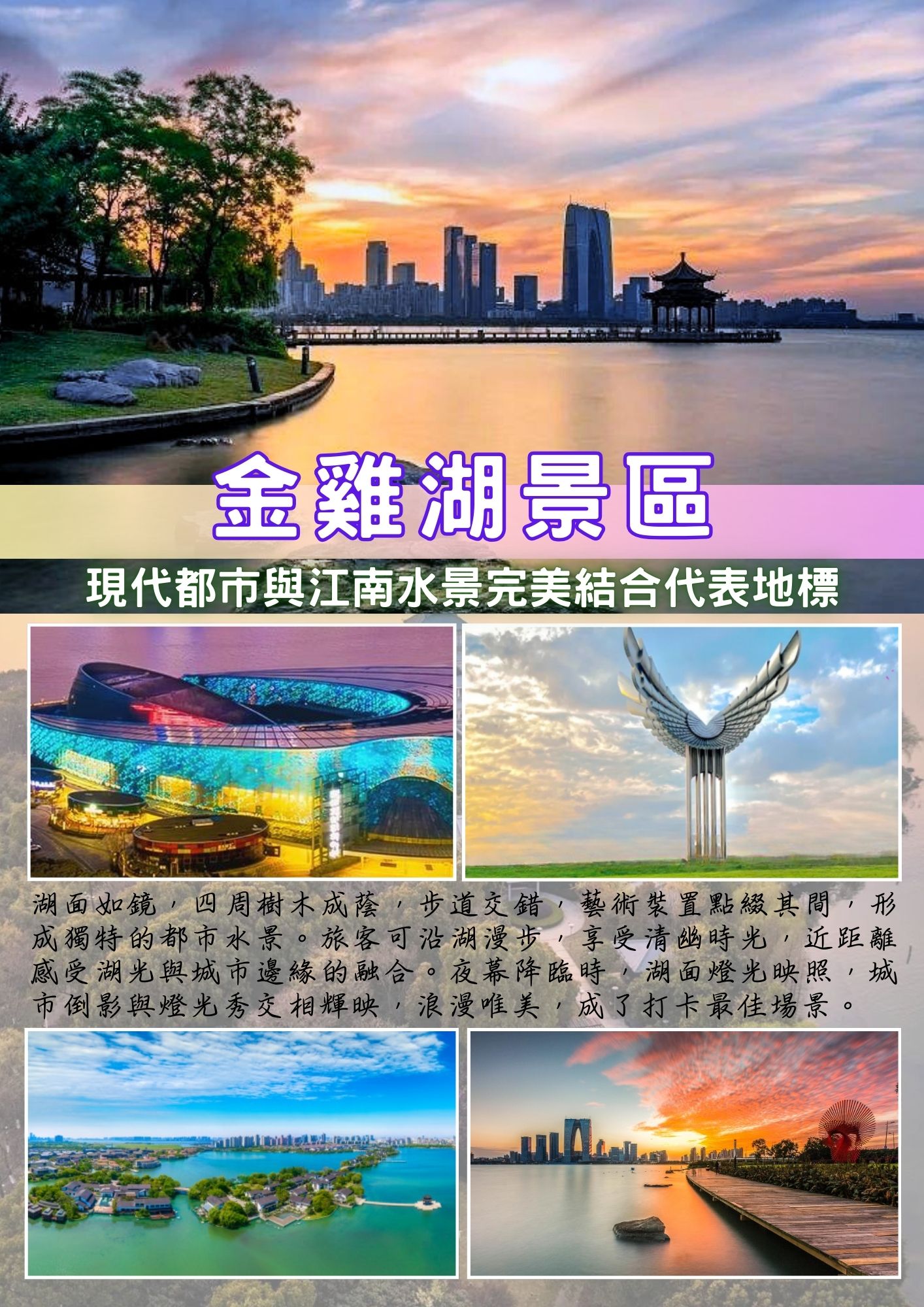 蘇州現代都市與江南水景完美結合的代表地標【金雞湖景區】以寬闊的金雞湖為核心,湖面如鏡,四周綠樹成蔭,步道縱橫,藝術裝置點綴其間,形成獨特的都市水景。遊客可沿湖漫步,享受悠閒時光,也可乘坐腳踏船或電動船,近距離感受湖光與城市天際線的融合。夜幕降臨時,湖面燈光映照,城市倒影與燈光秀交相輝映,浪漫唯美,成為打卡與攝影的絕佳場景。景區內設有蘇州文化藝術中心、博物館及購物商圈,提供豐富的休閒、文化與購物體驗;周邊餐飲咖啡館、特色酒吧林立,讓遊客可在湖畔輕鬆享用美食,感受都市生活的便利與悠閒。