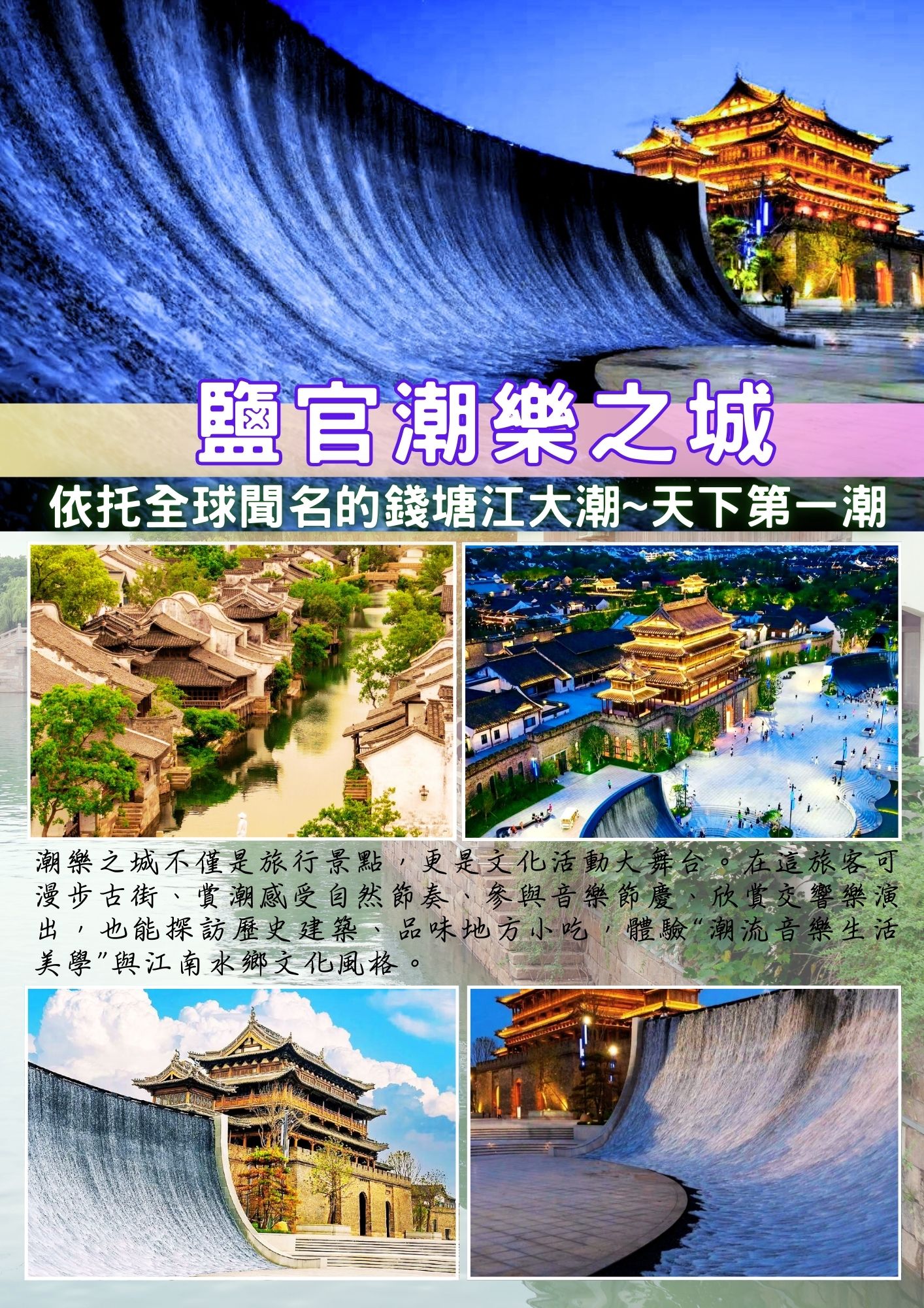 依托全球聞名的錢塘江大潮~天下第一潮【鹽官潮樂之城】位於浙江海寧鹽官鎮,是最新最火爆的旅遊文化地標,將千年江南古鎮的潮文化、音樂創意與休閒娛樂完美融合,打造出自然奇觀與文化潮流兼具的世界級潮流體驗目的地。,觀潮不再只是看潮,而是“潮起時聽潮樂、潮落時聽音樂”的沉浸式體驗,將自然力量的震撼與音樂藝術的激情共鳴。潮樂之城不僅是旅遊景點,更是文化活動大舞台。在這裡,遊客可漫步古街、賞潮感受自然節奏、參與音樂節慶、欣賞交響樂演出,也能探訪歷史建築、品味地方小吃,體驗“潮流音樂生活美學”與江南水鄉文化底蘊。鹽官潮樂之城不再是傳統古鎮,而是一個以潮水與音樂為靈魂的世界級文化旅遊熱點,吸引全國乃至全球旅遊者前來打卡、觀潮、聽潮、享受潮流文化的燃情時刻。