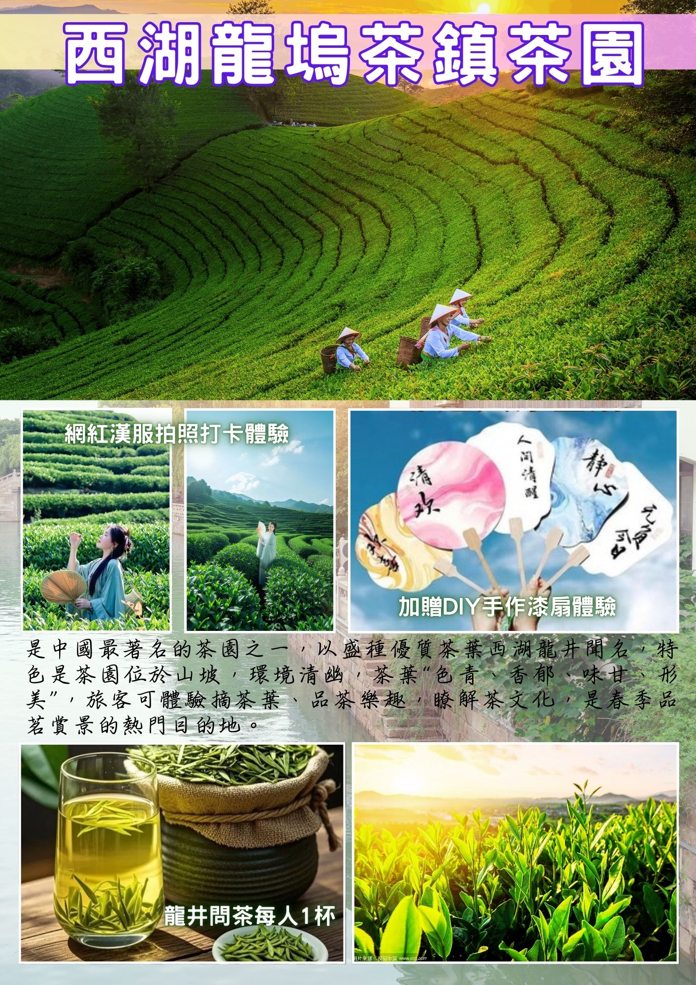 早餐後前往5A級景區規格~漫步中國第一茶鎮【龍塢茶鎮茶園】位於杭州龍井茶重要產區,四周群山環繞,茶園層層鋪展,展現江南茶鄉的自然風貌。行程安排多元文化體驗,包含傳統漆扇製作,親手感受工藝之美;換上漢服漫步茶園,在翠綠茶山中留下雅緻身影;並透過「龍井問茶」了解茶葉採製流程與品茗文化。整體行程結合自然景觀、傳統工藝與生活美學,節奏舒緩而富深度,讓旅客在茶香與山色中,體會杭州獨有的文化韻味。★★加贈DIY手作漆扇體驗+漢服打卡體驗+龍井問茶每人1杯★★