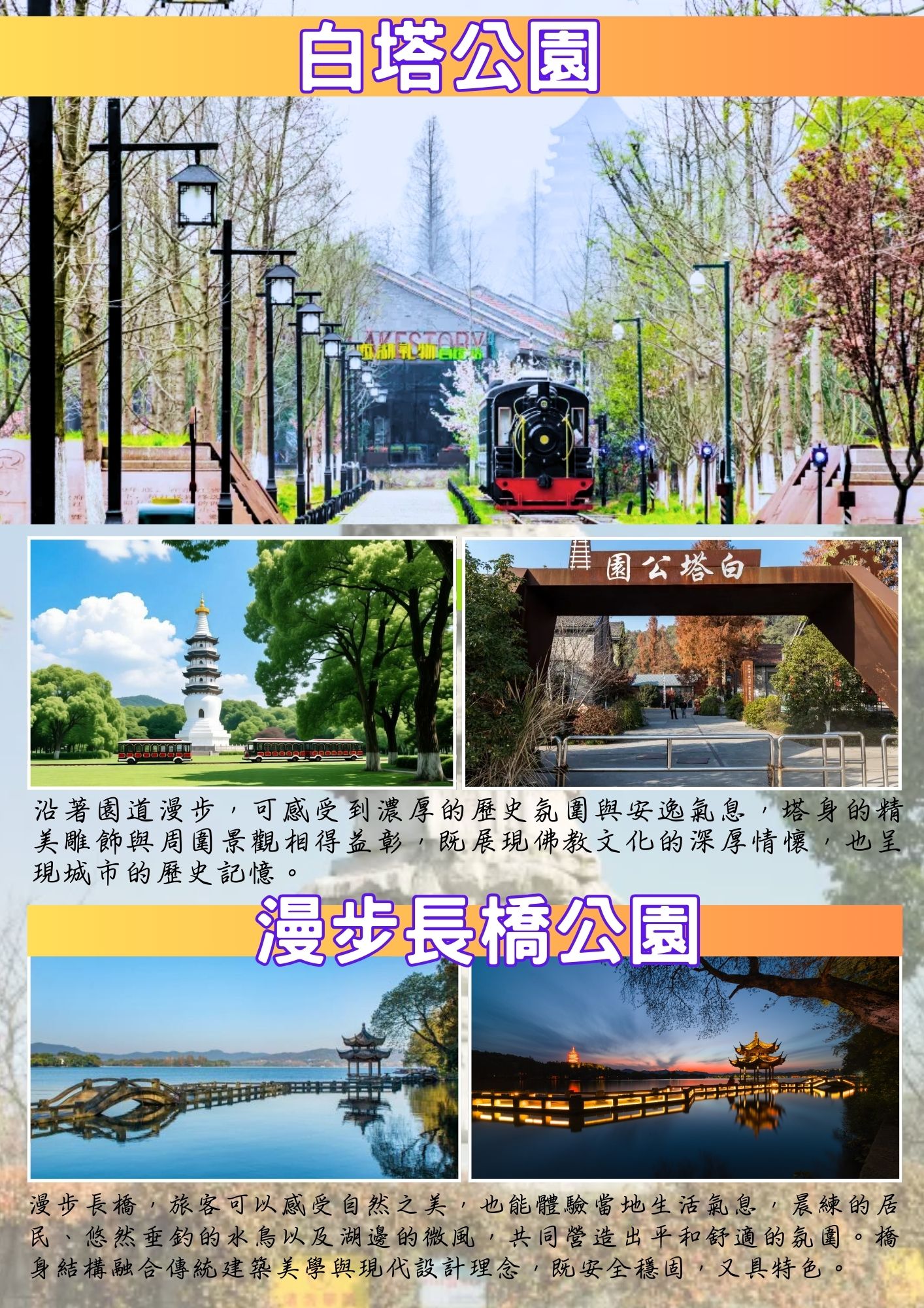 杭州重要歷史地標與文化象徵【白塔公園】始建於明代,塔身潔白高聳,造型典雅,展現中國古典建築美學。周邊環境綠意盎然,四季景色各具特色:春天花木爭妍,鳥語盈耳;夏季綠蔭成行,微風拂過帶來清涼;秋日落葉紛飛,映照塔身更顯古樸典雅;冬季白雪覆蓋,整體景致靜謐而莊重。沿著園道漫步,可感受到濃厚的歷史氛圍與寧靜氣息,塔身的精緻雕飾與周圍景觀相得益彰,既展現佛教文化的深厚底蘊,也呈現城市的歷史記憶。周邊設有休憩空間和觀景點,方便遊客駐足欣賞,享受片刻悠閒。白塔不僅是一個歷史景觀,更是一段文化旅程,遊客在此可以靜心感受建築與自然的和諧之美,體驗古城風貌與文化積澱,留下深刻而獨特的旅行記憶。