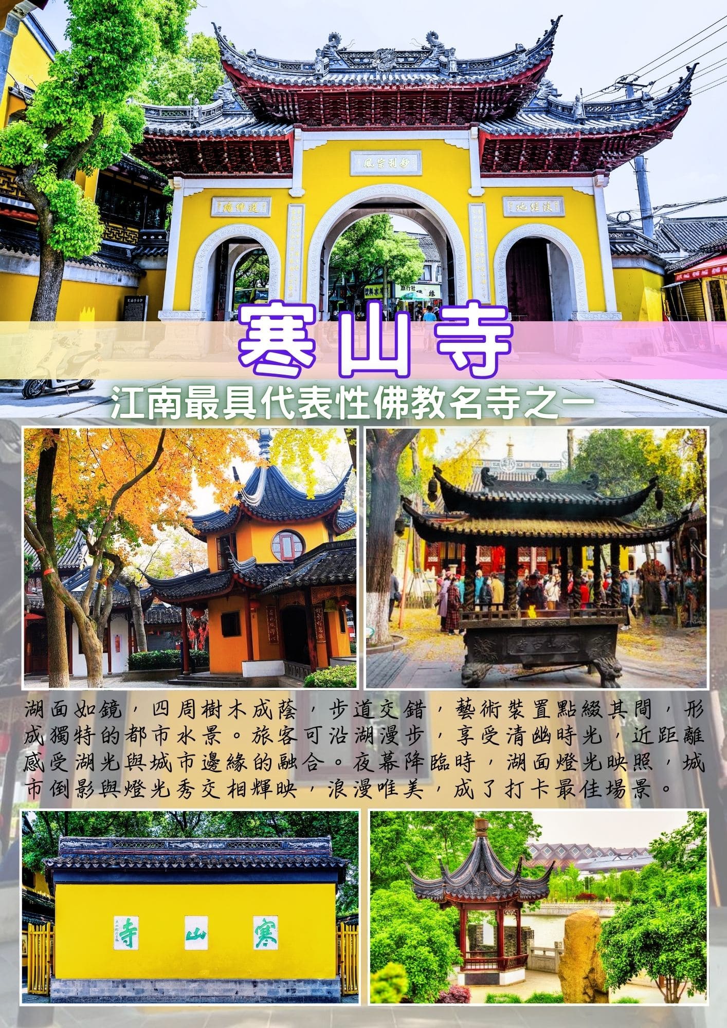 江南最具代表性佛教名剎之一【寒山寺】位於江蘇蘇州古城西側,始建於南朝梁代,距今已有一千五百多年歷史,寺名因唐代詩人張繼的千古名篇《楓橋夜泊》而聞名天下,「姑蘇城外寒山寺,夜半鐘聲到客船」一句,讓寒山寺不僅是一座寺院,更成為無數人心中對江南、對詩意中國的想像起點。寺院臨古運河而建,環境清幽,鐘聲迴盪,彷彿仍能感受昔日舟行夜泊、聽鐘入夢的情境。走進寒山寺,古樸莊嚴的山門、天王殿、大雄寶殿層層展開,紅牆黛瓦與蒼松翠竹相映成趣,處處散發出靜謐安定的氛圍。寺內最具代表性的寒山鐘,象徵洗滌塵心、祈求平安,每逢除夕夜的敲鐘祈福,更吸引無數信眾與遊客前來感受跨越千年的文化儀式。