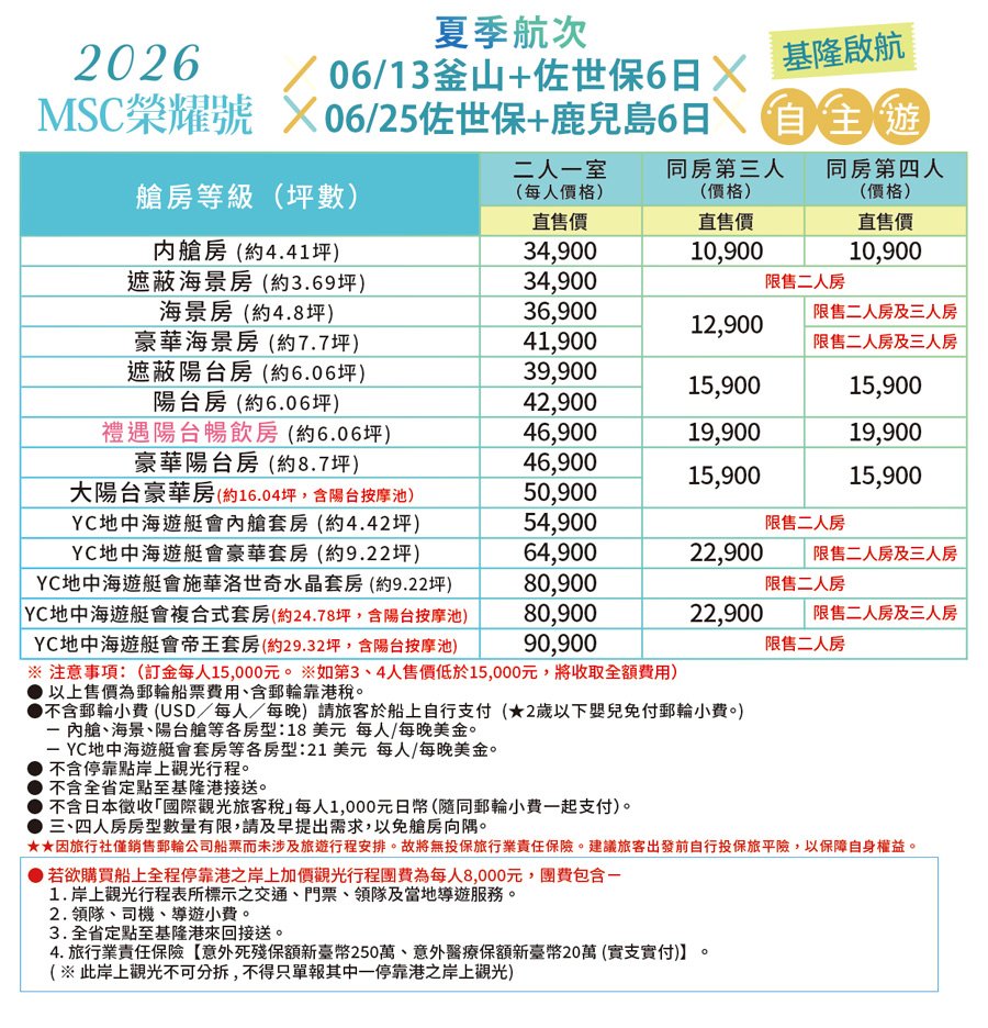 ※ 本商品性質為自由行,恕無領隊隨程服務,船上所有服務皆由地中海郵輪-榮耀號提供。